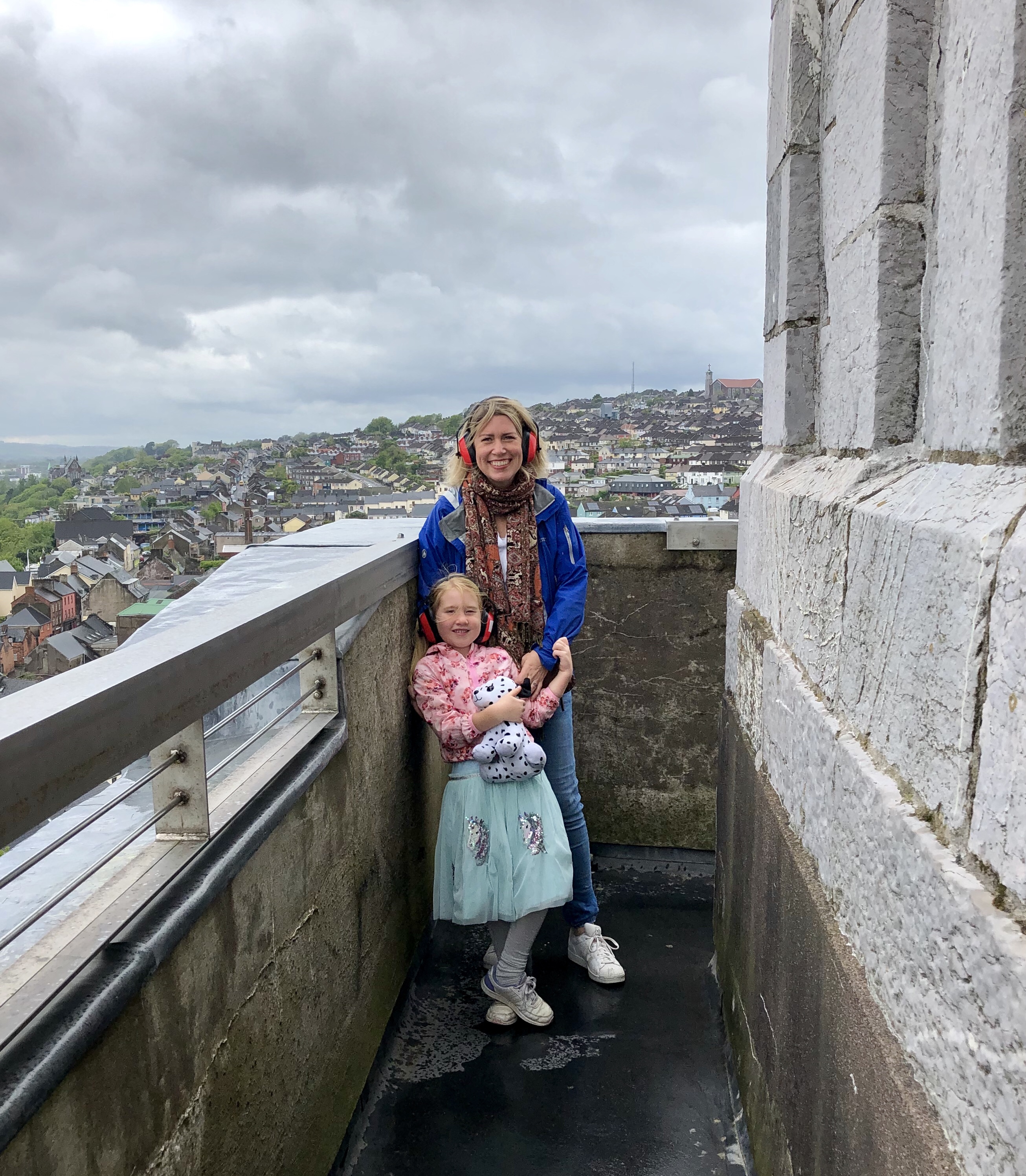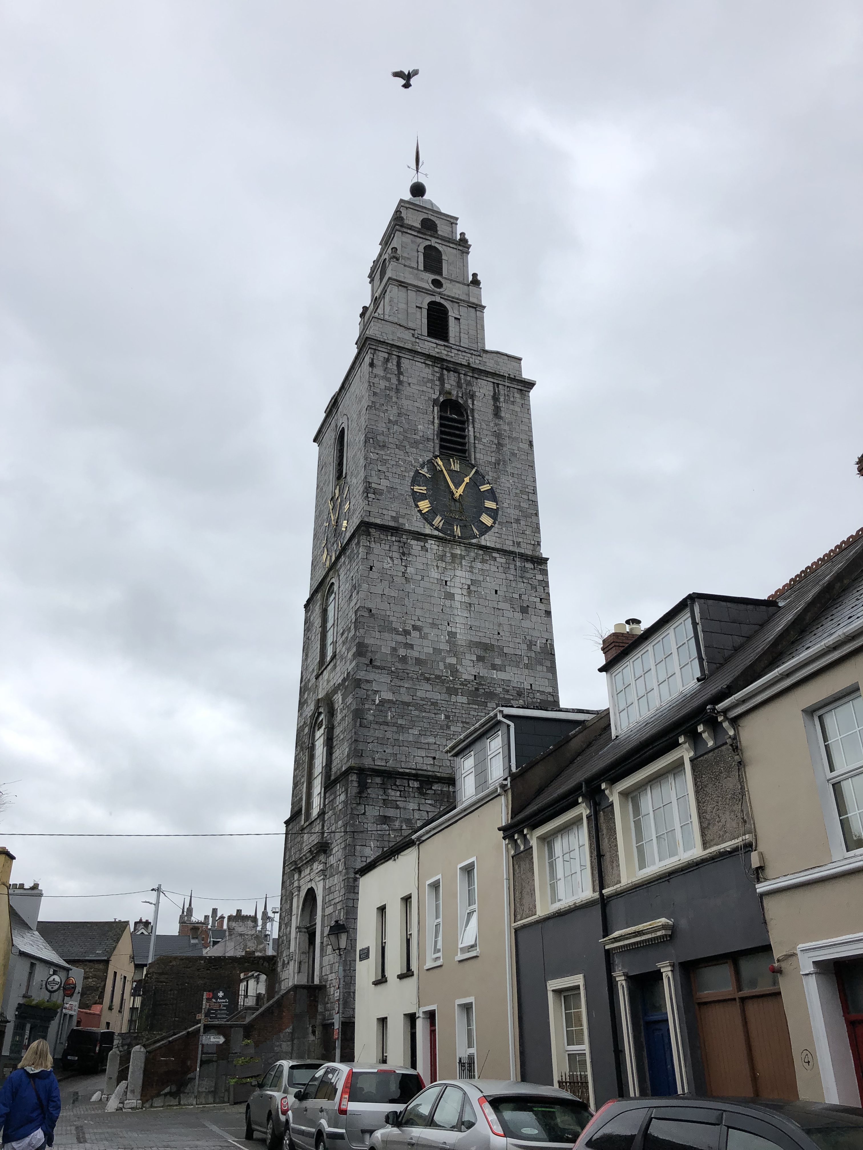 The next day we were joined by Kasi and Finn as we took the hop-on/hop-off bus around the town. Cherie and I are not generally ones for tours, but this time it turned out to be a good way for the four of us to cover a lot of ground without exhausting ourselves. One highlight was the Shandon Bells. In the Shandon neighborhood of Cork is the Church of St. Anne which has a lovely bell tower topped by an enormous weather vane in the shape of a salmon. It also contains a huge clock mechanism which, apparently, was the largest in Europe until the construction of Big Ben in London. Locals call it the Four-Faced Liar because each of the clock faces display a slightly different time because of the wind which affects the movement of the hands.