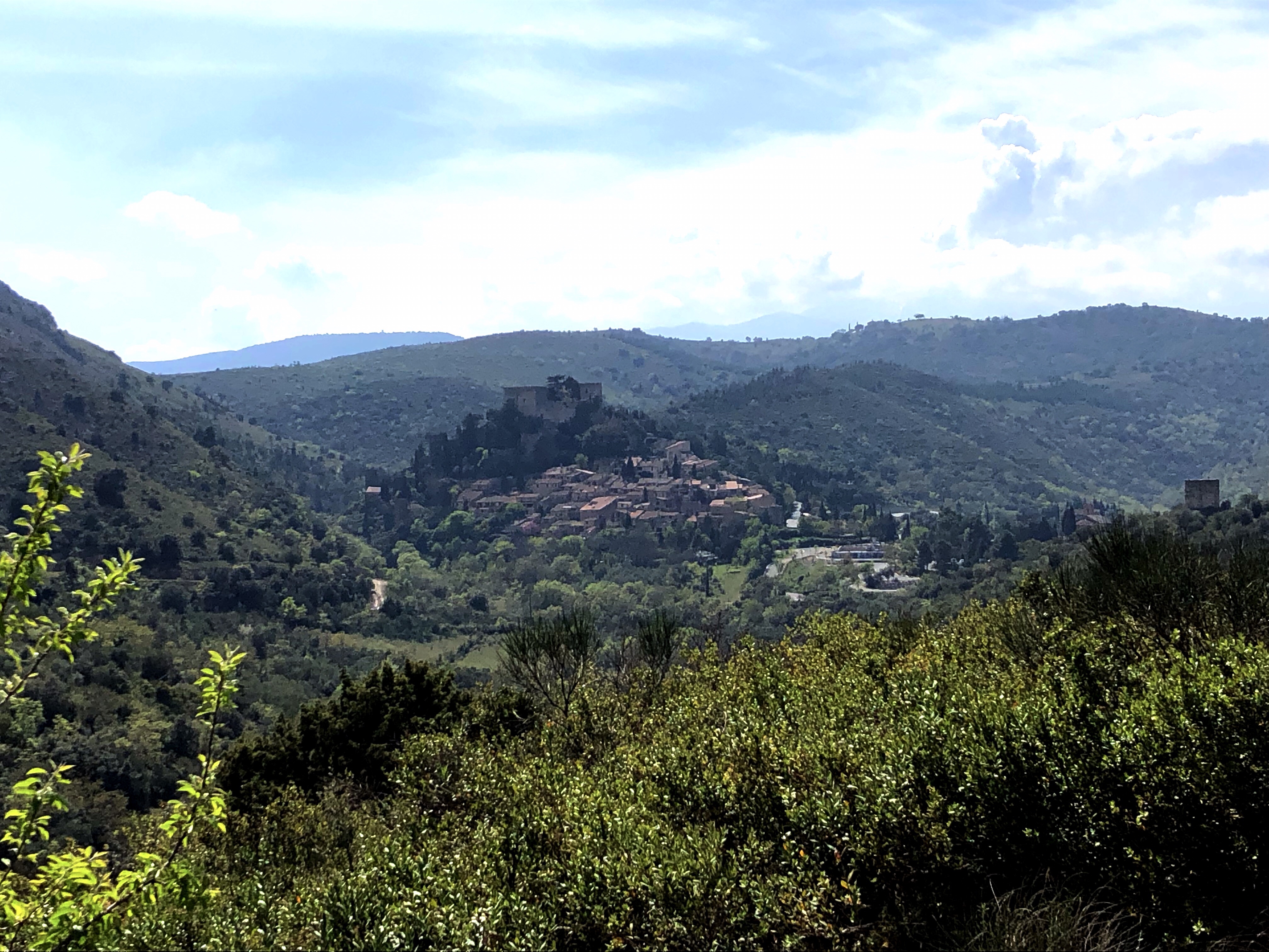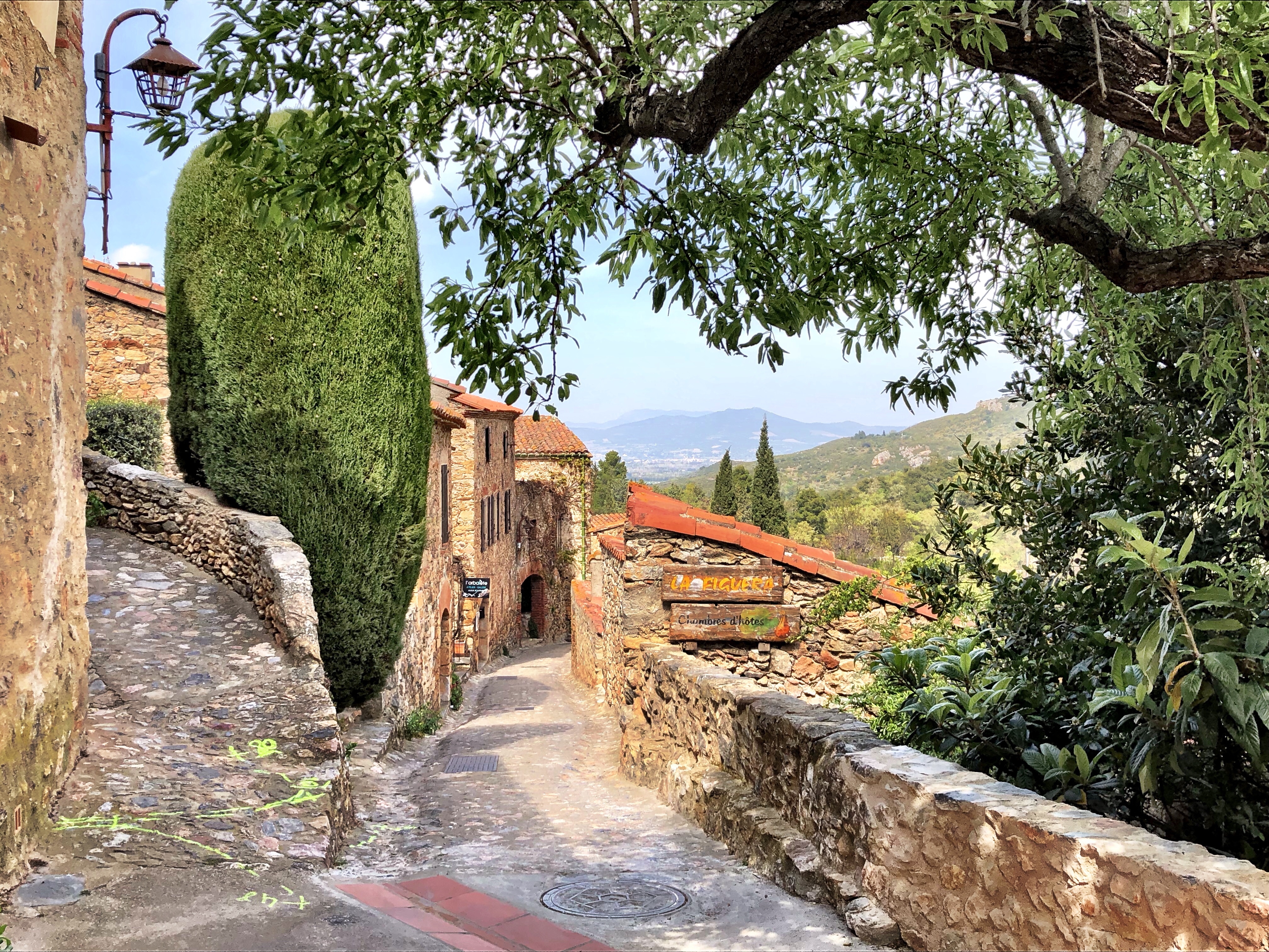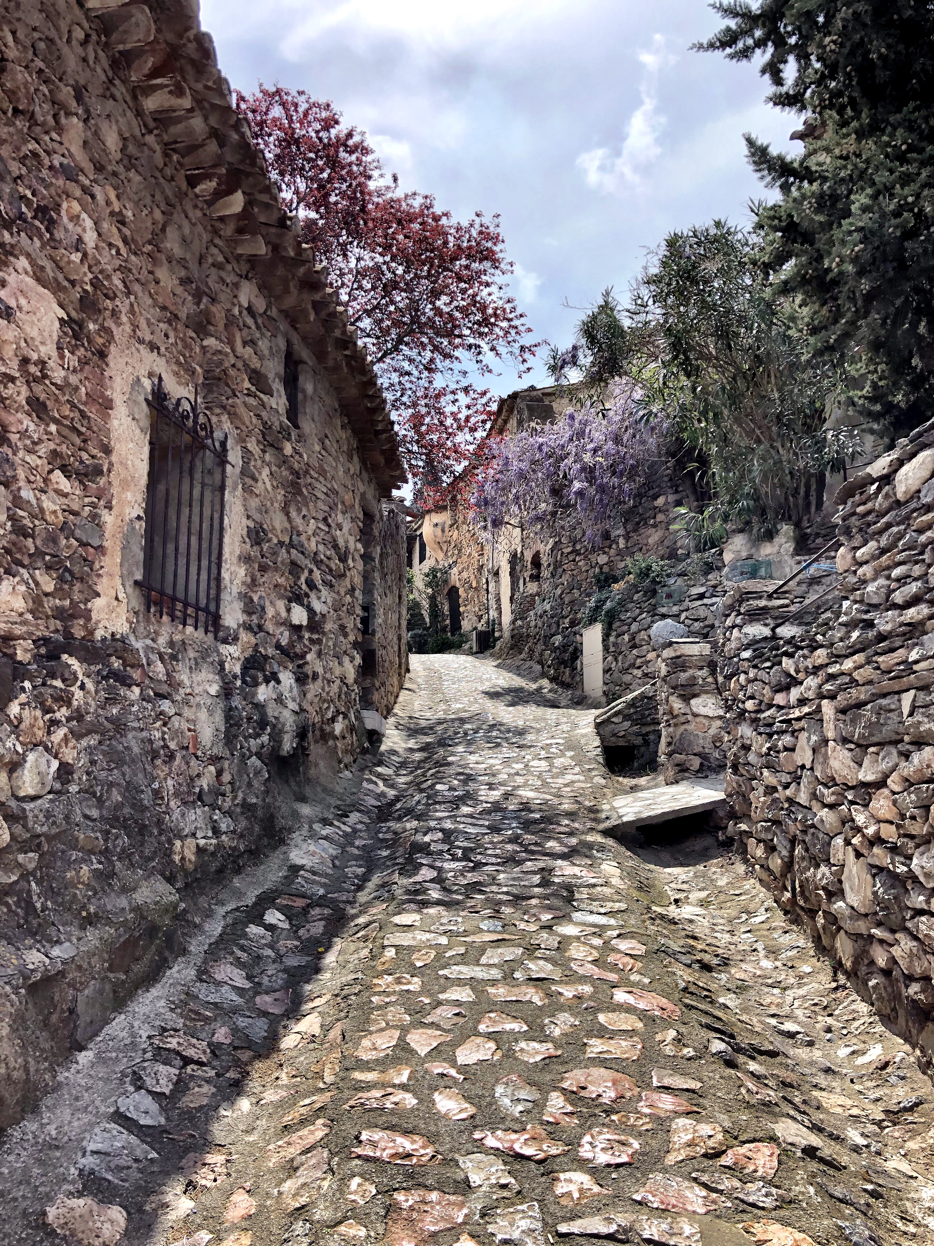 Far up in the hills of the Pyrenees lies the village of Castelnou. Perched on a rocky spur, the village’s houses cling to the steep slopes, huddled together around narrow cobbled streets below the medieval keep which still stands a sentinel watch over the rugged landscape. Almost on a whim we decided to visit Castelnou and we were richly rewarded. It was beautiful and we had the village almost to ourselves. A kind woman in her open-air café just before the fortified village gate chatted with us as we stopped for a brief rest and glasses of Moroccan tea. We were the first Americans she had ever met in Castelnou. Hopefully, we left her with a good impression! For our part, Castelnou left us with a lovely, lasting impression.