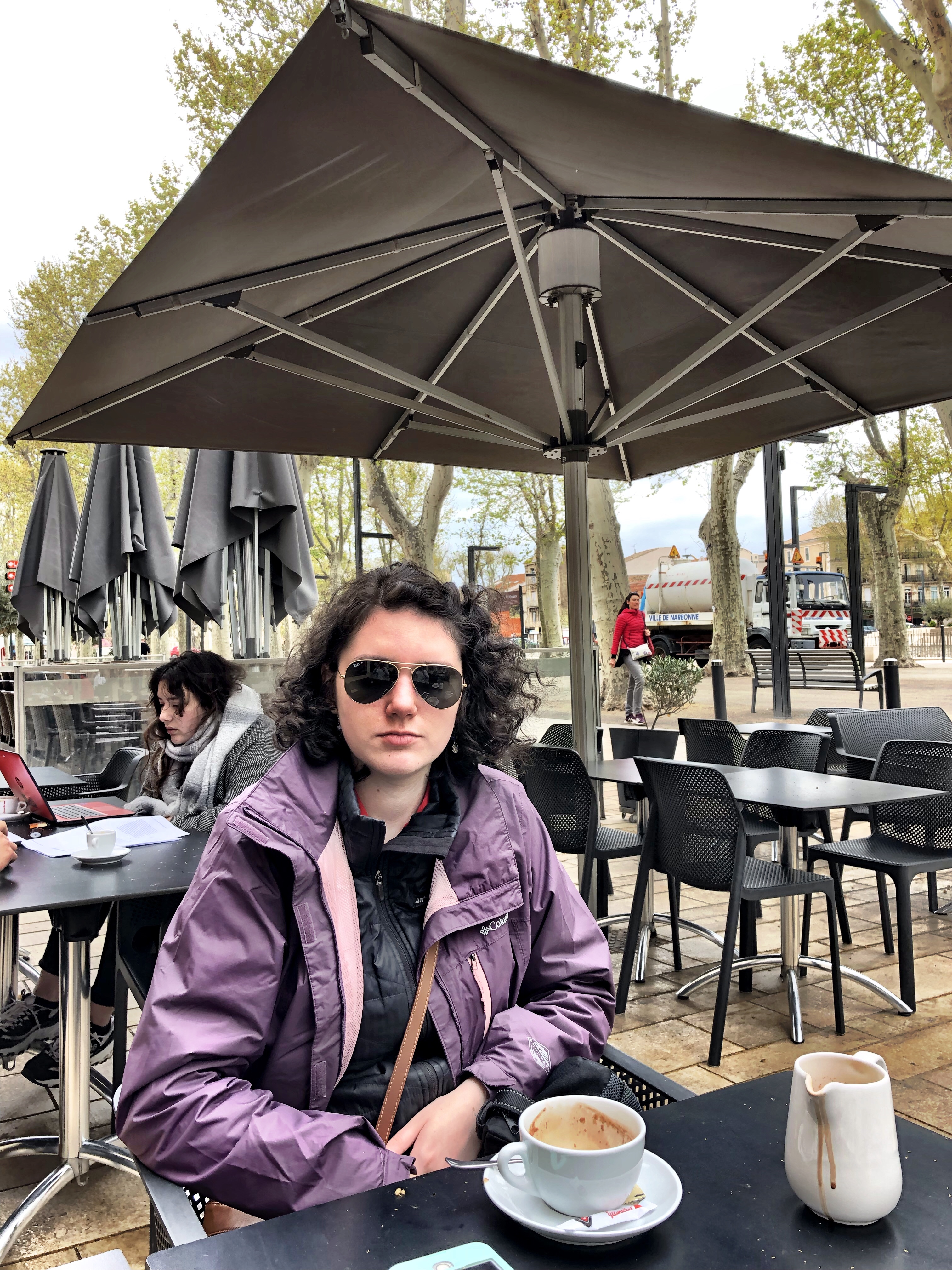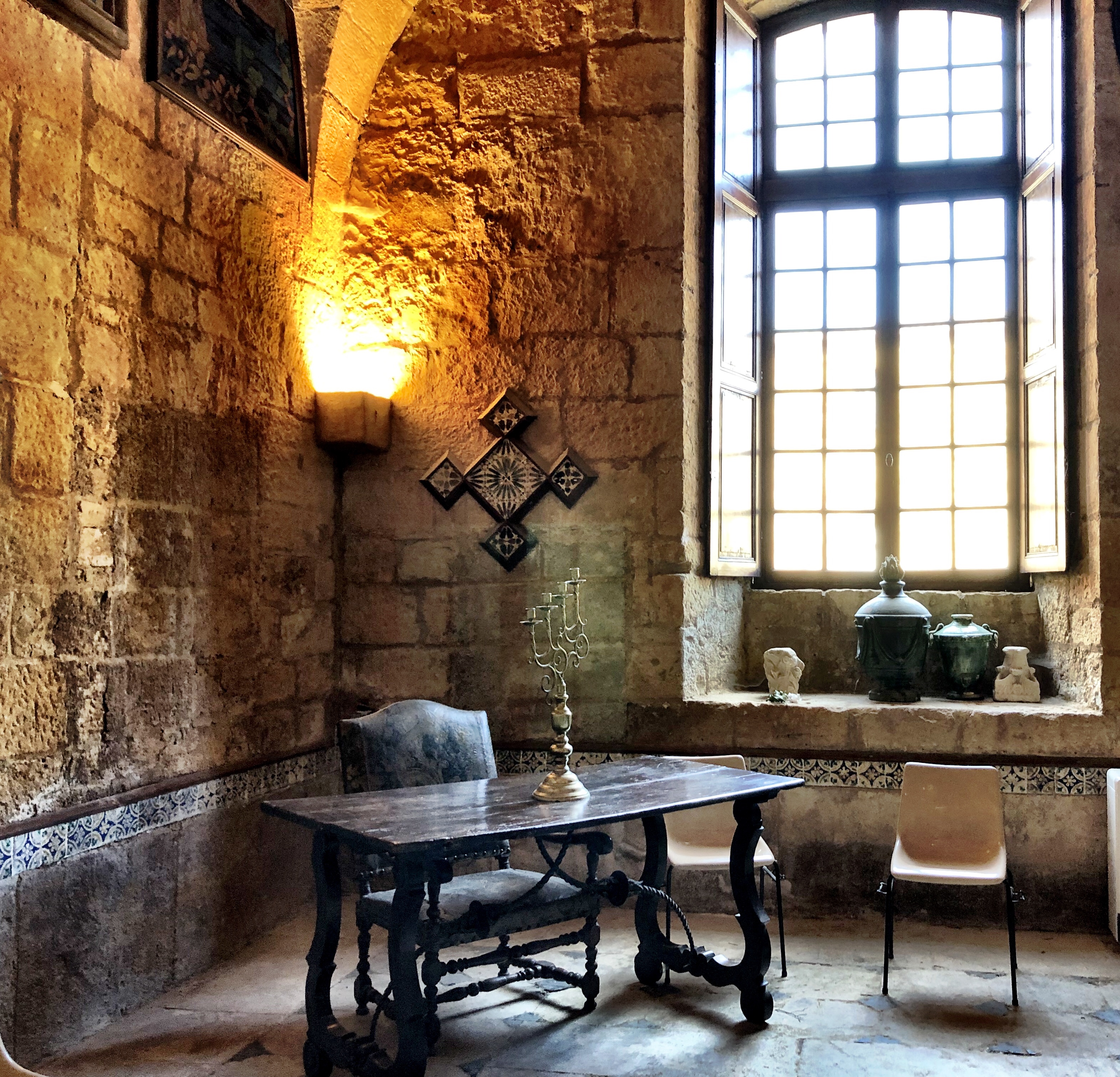 In the bustling city of Perpignan we saw many interesting sites, including the Palace of the Kings of Majorca. In the center of a large military fortification, the palace was built in the 13th century when Perpignan was part of the Kingdom of Majorca. It was so different from what any of us have ever seen. We spent a lovely afternoon investigating its many spaces, including a somewhat harrowing climb up an open spiral staircase in order to get this spectacular view of the palace’s courtyard from high above: