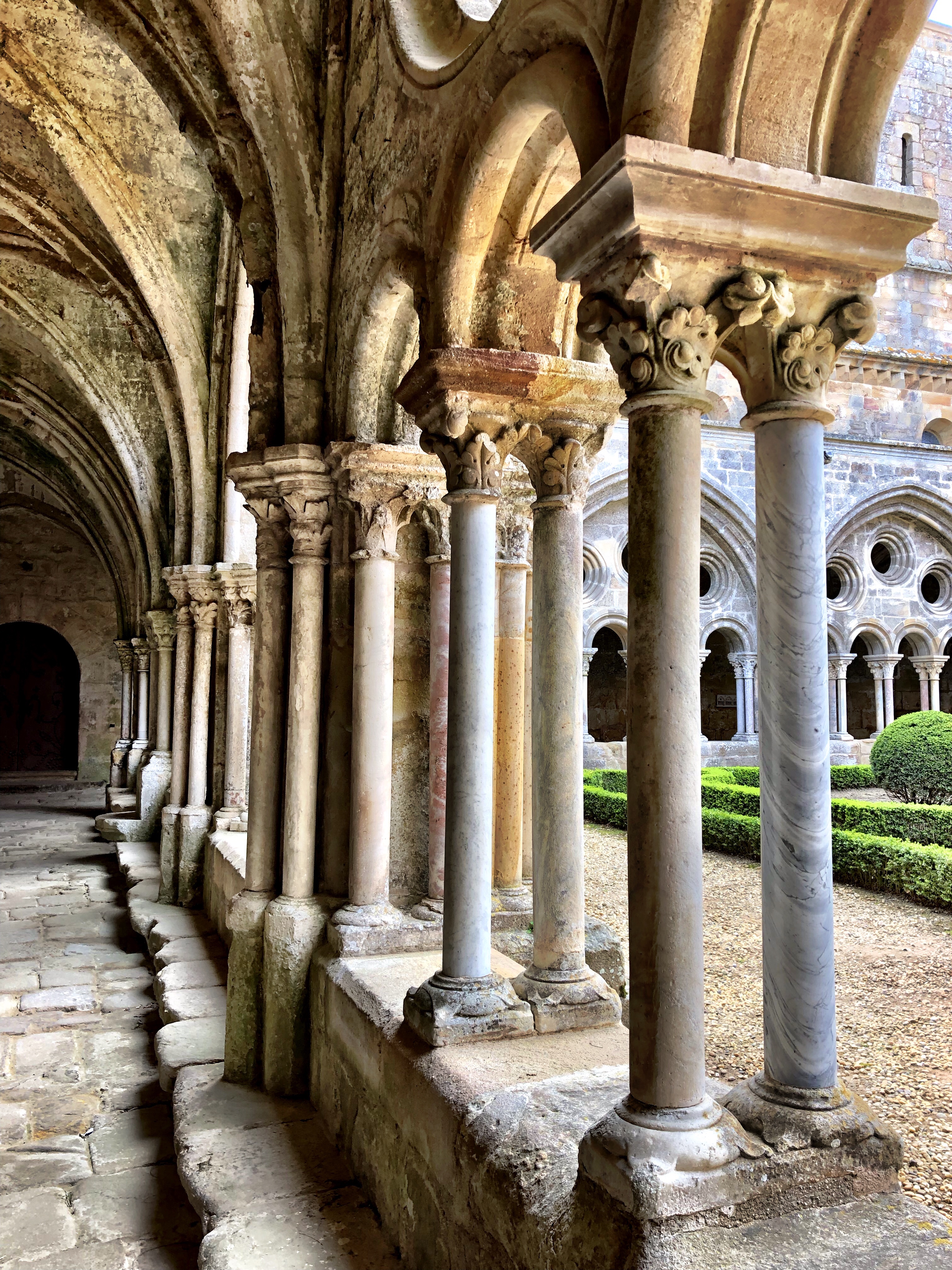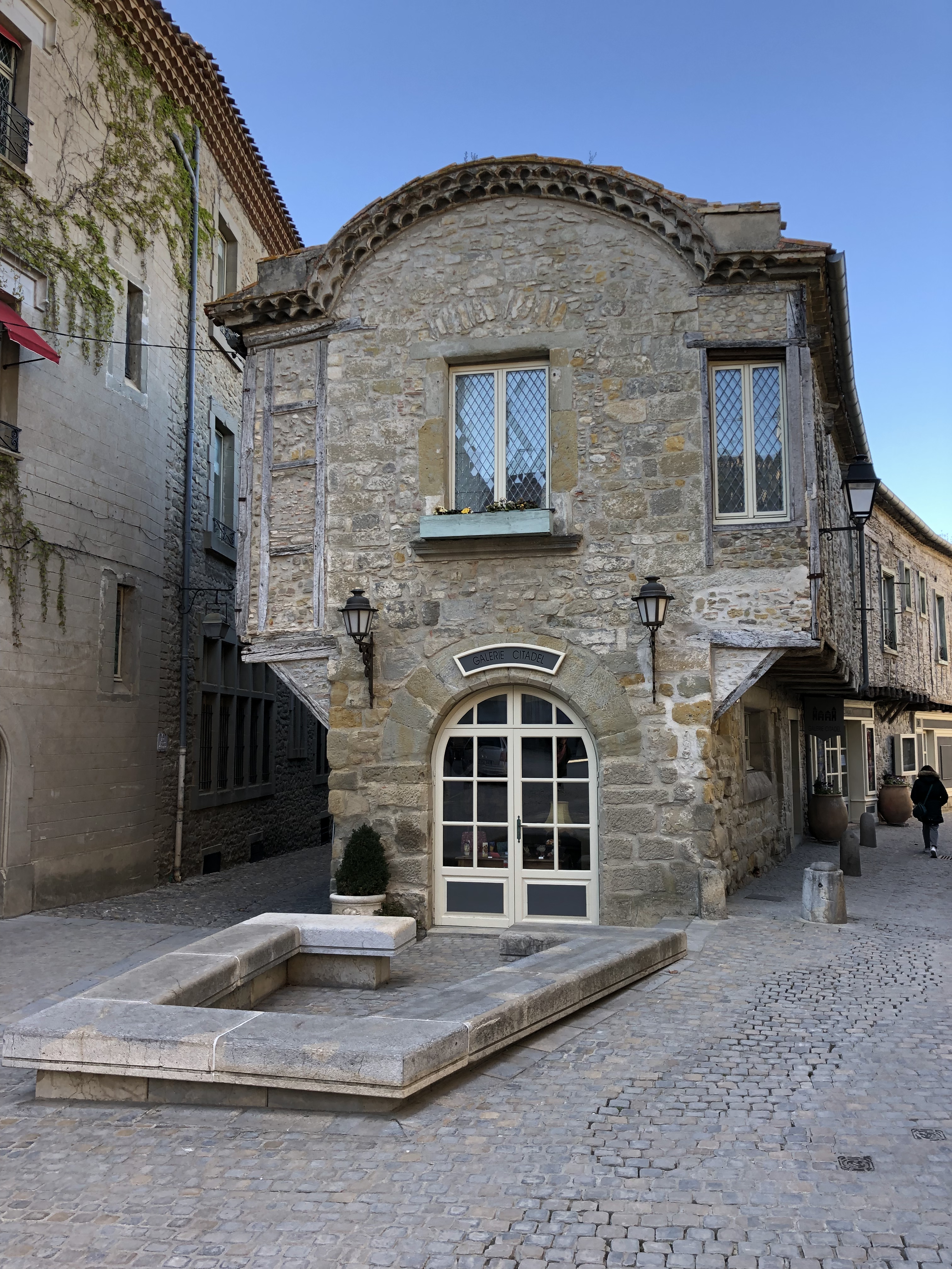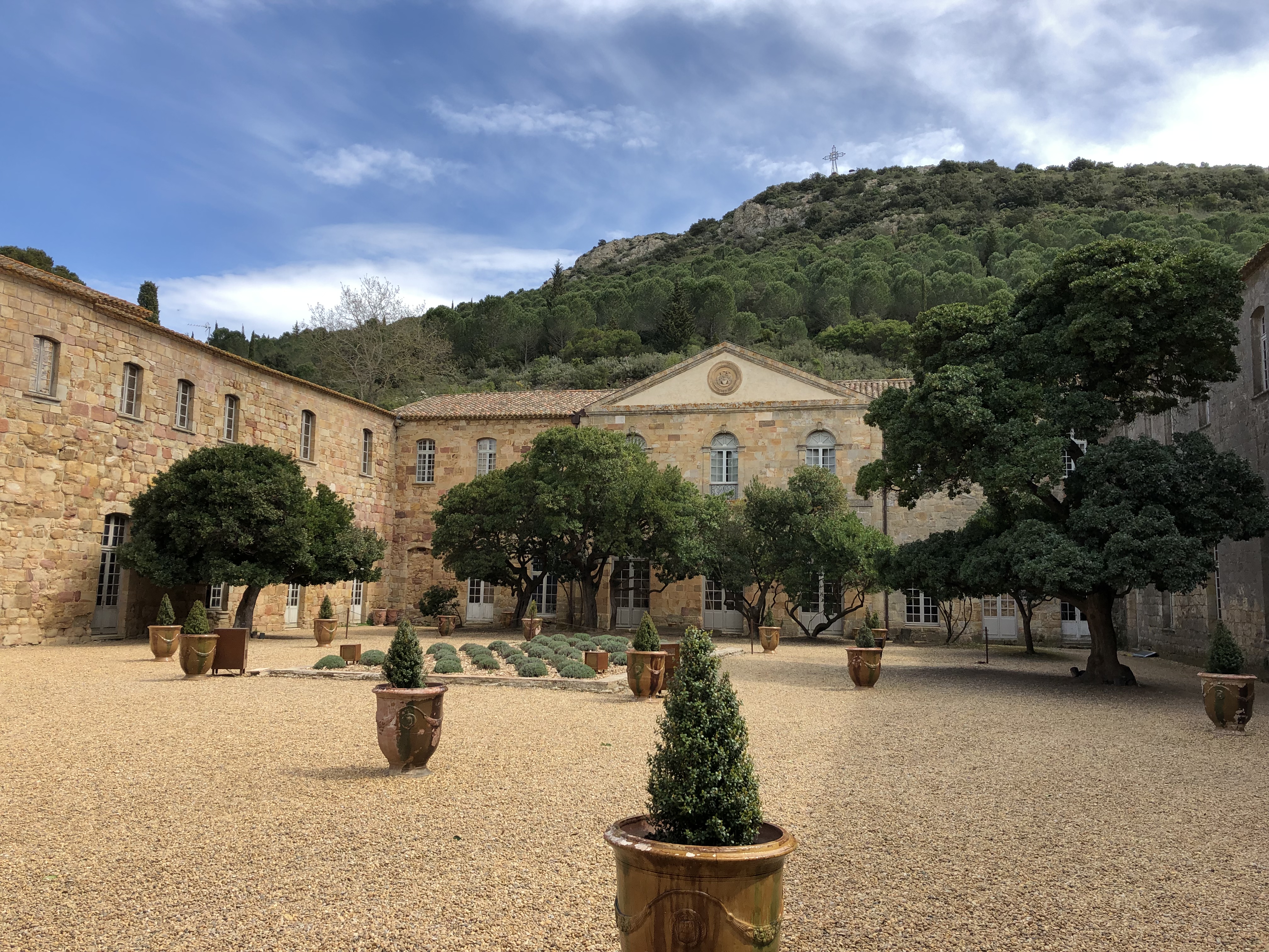 Lastly, I will just mention the Abbaye de Fontfroide, a Cistercian abbey in the isolated Corbières hills west of Narbonne. It’s a beautiful monastery in a lovely setting, nestled in a narrow valley amongst forested hills festooned with pine and olive trees. Expecting some unattended ruins, we were surprised to discover a well-maintained monument, to include a lovely restaurant where we enjoyed an excellent lunch before we set about exploring this historic edifice. It’s privately owned and the owners are also one of the many producers of Corbières wine in the area. They also appear to rent out the abbey as a film location; we arrived to find that several rooms of the abbey were temporarily off limits as a film crew was beginning to dismantle set decoration, lighting, sound and catering equipment that had been set up in many areas. A bit disappointing, but we were still able to see a great deal and we had a rewarding experience.