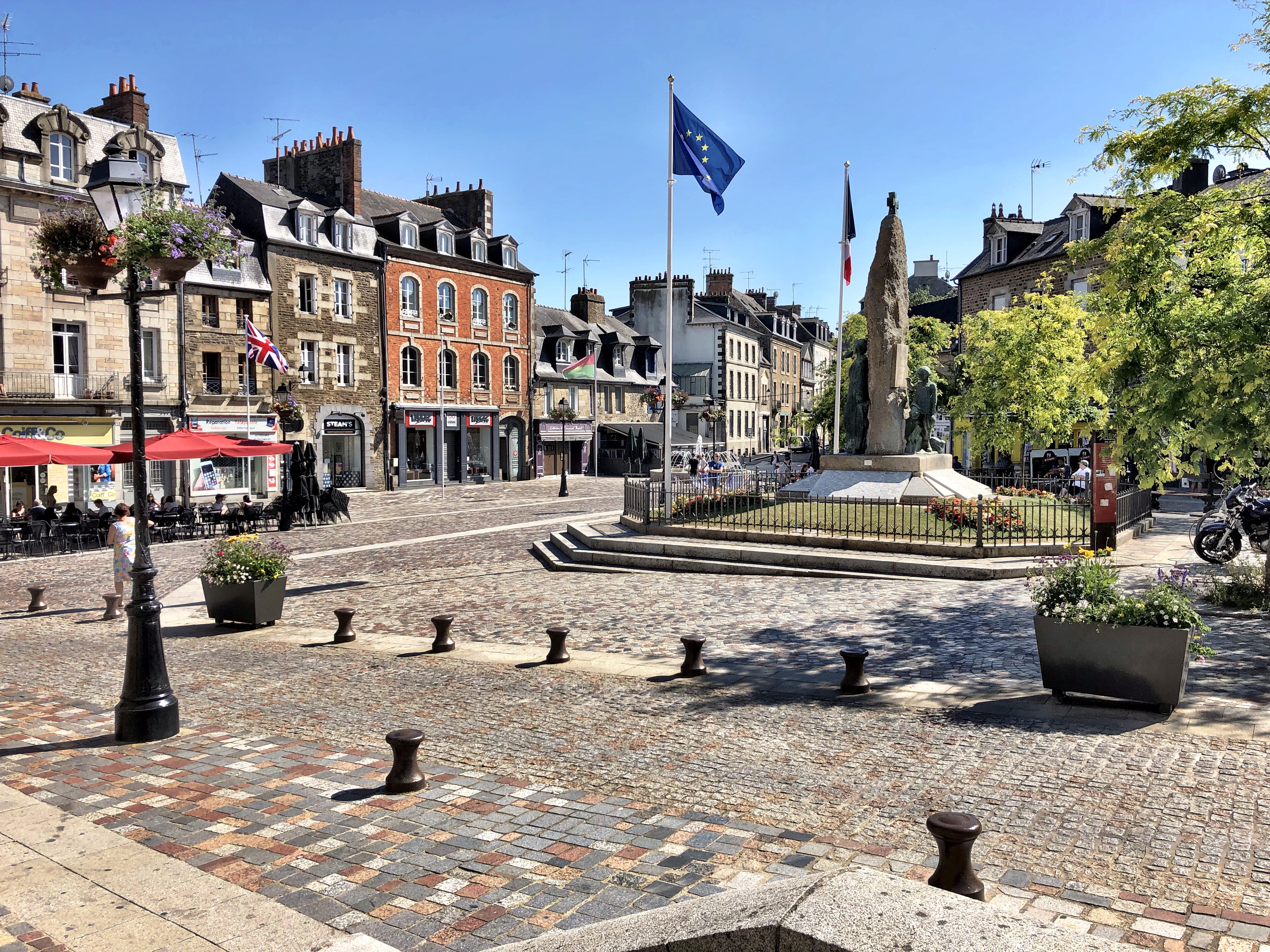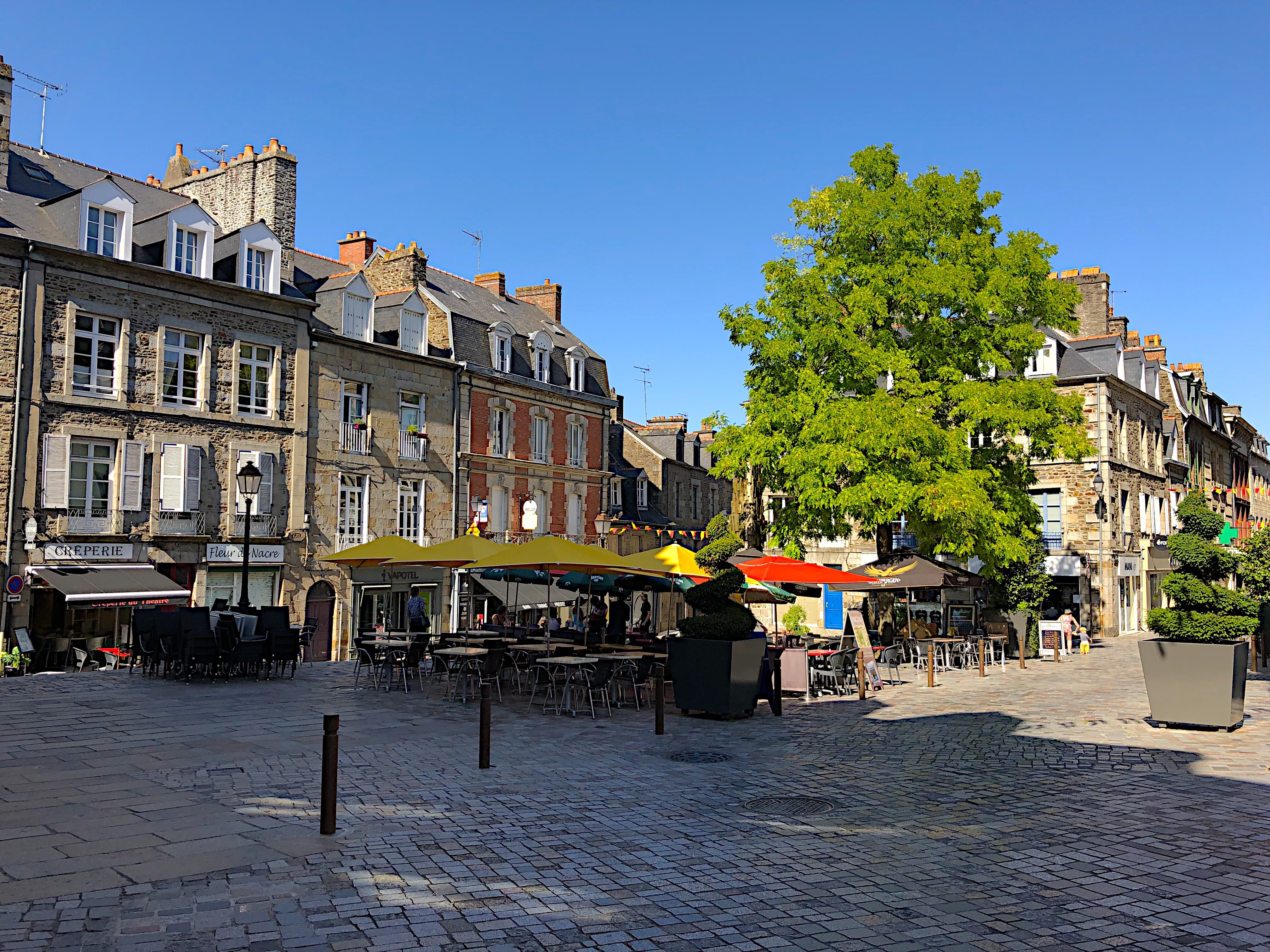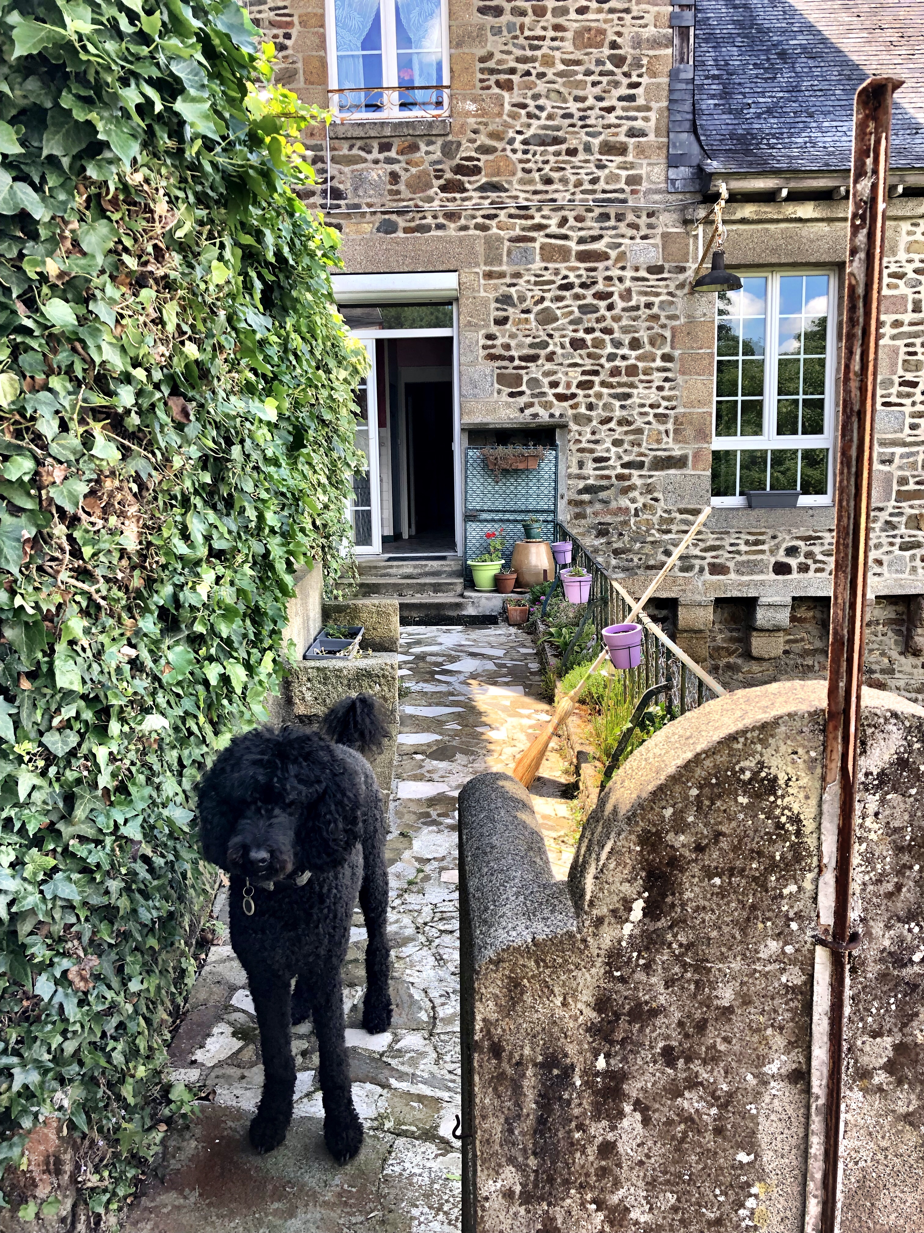 The river Aven forms the spine of the town. As it flows through the center of the ville it is channelled into numerous mill races (the mills themselves now long disused) which are criss-crossed by a series of pedestrian bridges. The bridges are well-kept and made all the more colorful with rows of flowers in planters along their railings. The watercourse is often interrupted by patches of large boulders, strewn about as though, in the dim mists of times now long forgotten, géantes celtique were interrupted in their crude game of pétanque, leaving their pieces lay as they were thrown. Along the banks of the river, numerous lavoirs step down to the water, where once the householders of the town washed their clothes. In the rare quiet moment, we could imagine the sounds of scrubbing, beating and rinsing as it must have been for centuries. On this warm July day of sun and puffy clouds, the whole made for really pleasant scene. We soaked it in for a good long time as we meandered along the paths and bridges.