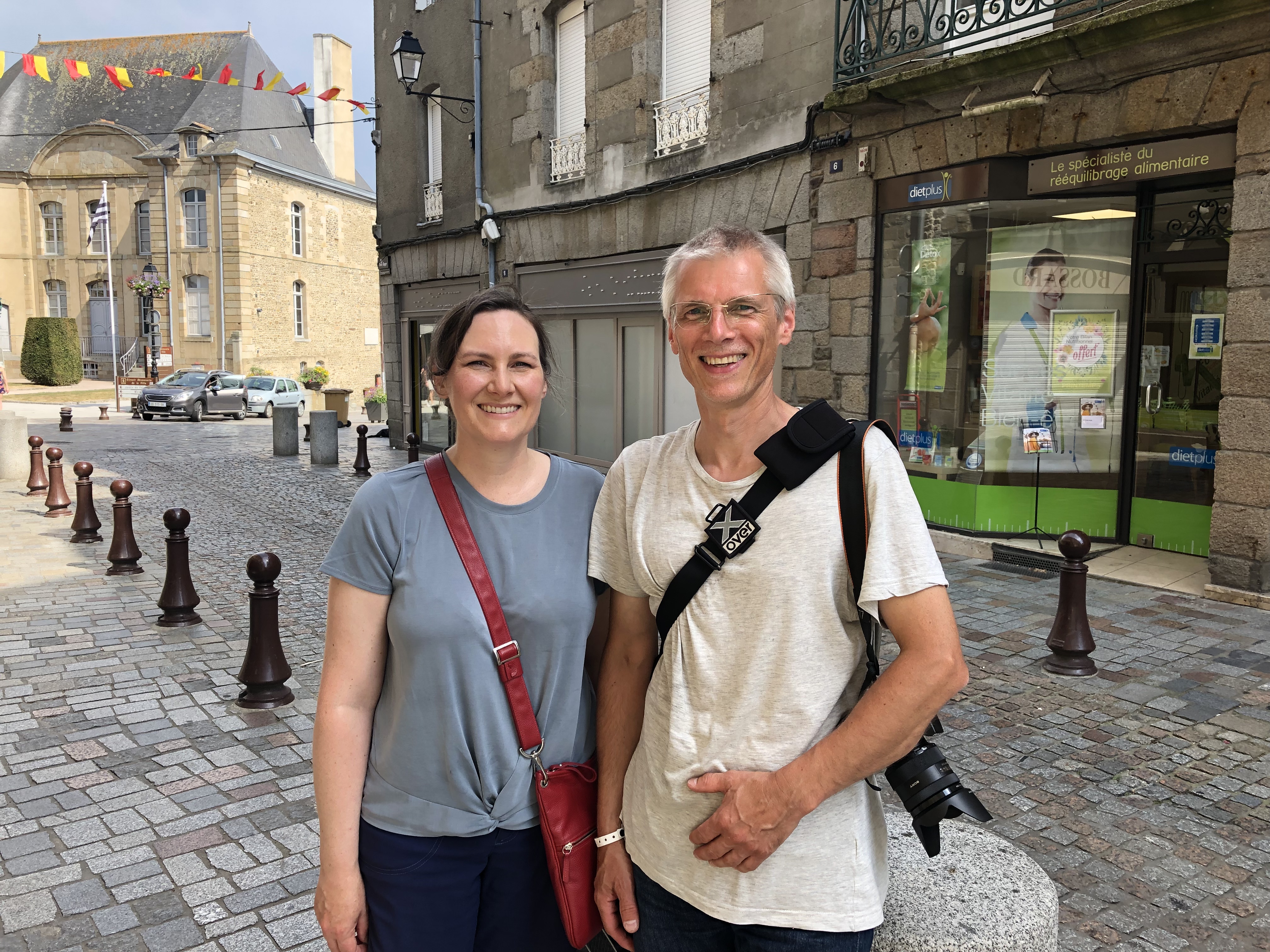 Crossing the Villaine river and continuing further eastward for 15 minutes brought us to Grand-Fougeray. It’s a small-ish town of around 2,500 souls with a lovely square. Even though the end of lunchtime was fast approaching the restaurants terraces were still lively with diners enjoying their meals en plein air on this relaxed summer’s day. It made for a nice atmosphere amidst the backdrop of well-maintained 18th and 19th century facades and riots of flowers blooming in the numerous planters dotted around the square. So typically French. These scenes, so common in France, make us smile every time.