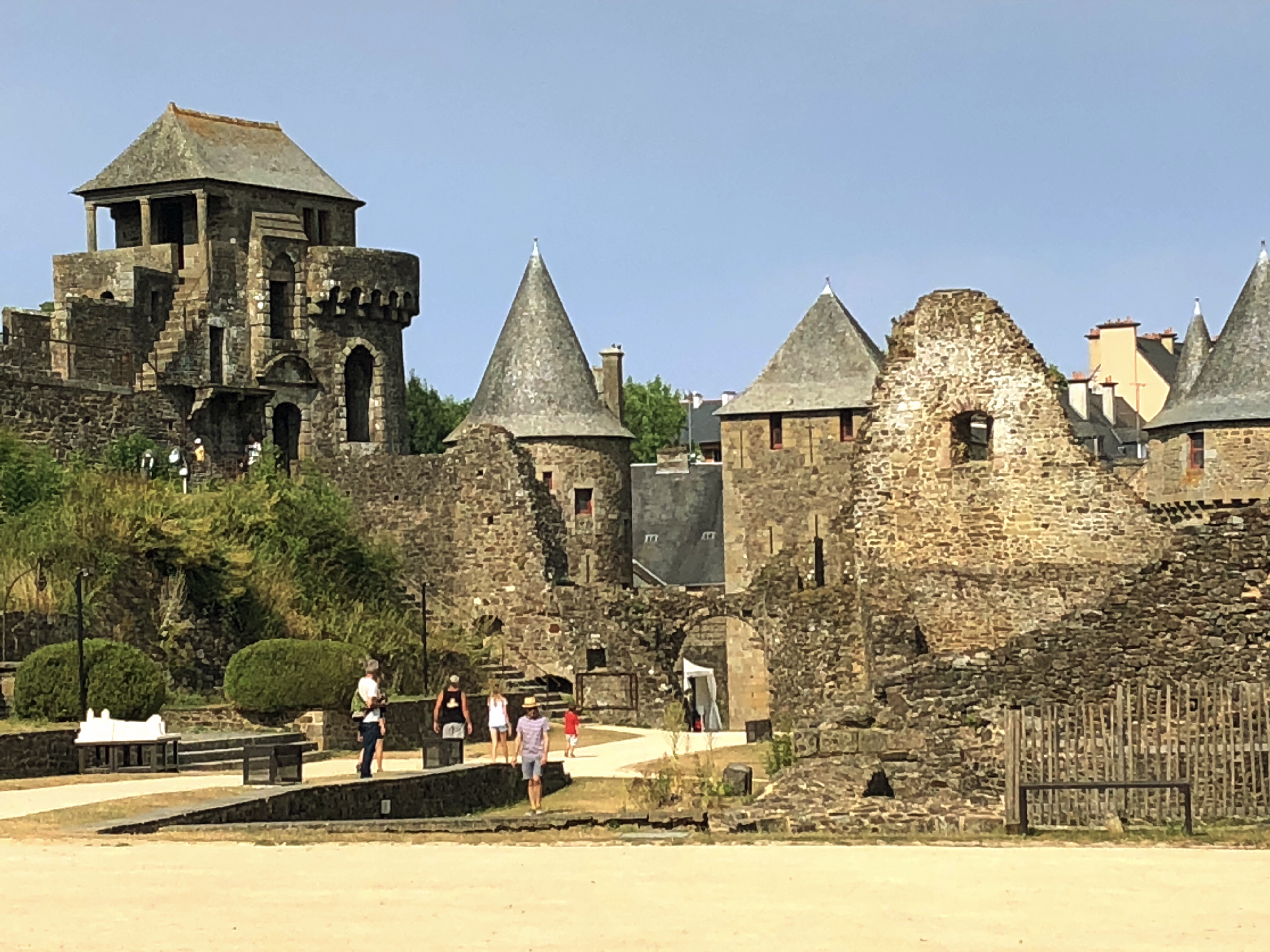 Our guide-book merely includes a brief mention of the Tour du Guesclin. No photos. From the description, we expected a stumpy ruin poking out of the grass, just recognizable as having once been a tower. But as we drove into the casually-marked parking lot, we were stunned to be confronted by an intact monumental stone tower 34 meters high and 13 meters wide. Wow! Although once part of a walled castle, the tower now stands alone, the last sentinel still keeping watch over this part of Bretagne’s ancient border. A beautiful and serene park and arboretum has grown up around the tower, resulting in a very pleasant setting. The tower’s neighbor next door is an eighteenth-century château-cum-convent and on this day several of the nuns had ventured out between their daily services to enjoy the park and take a jovial turn up the spiral staircase of the edifice which overlooks their garden walls.