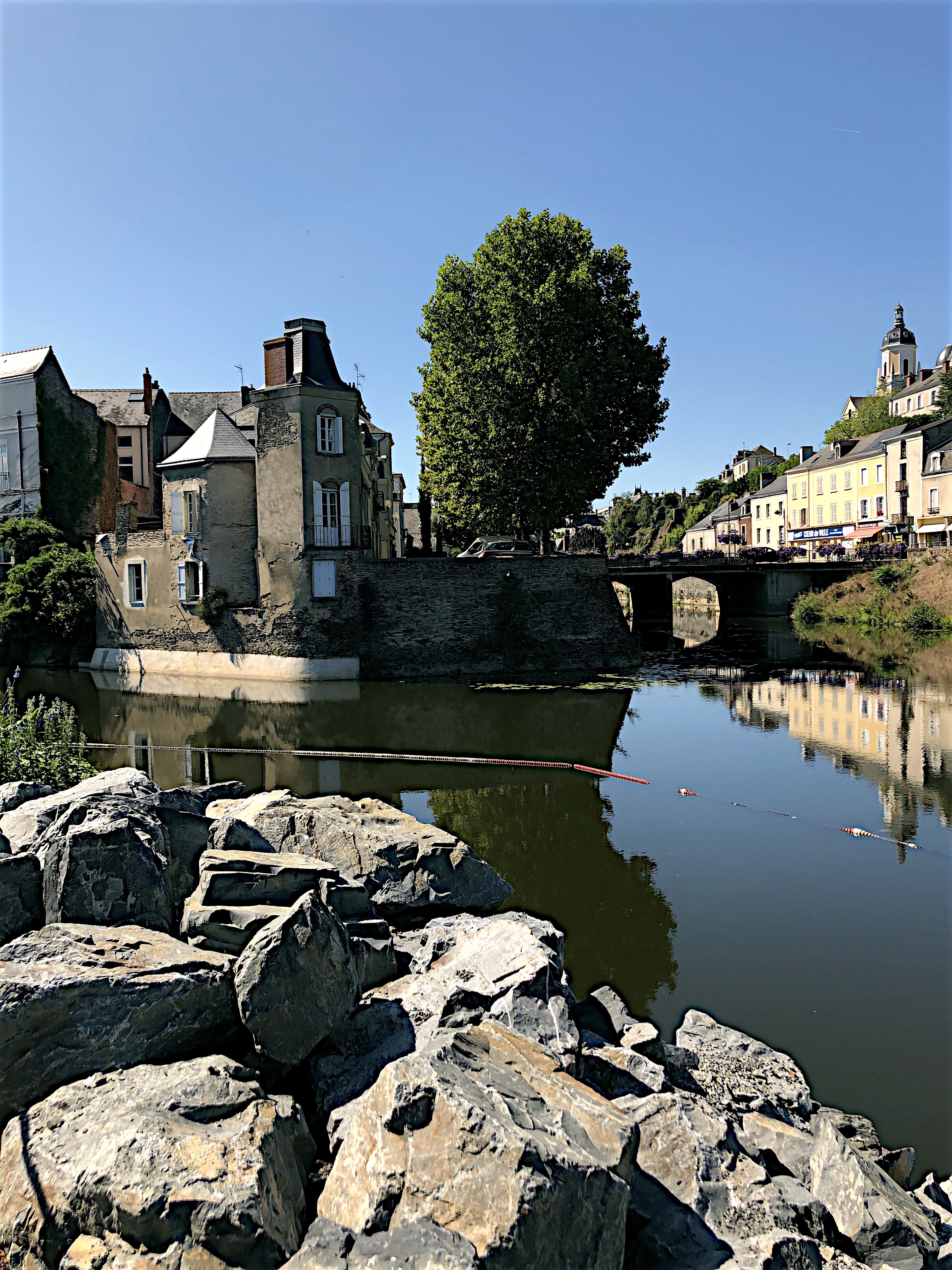 Filled with a sense of accomplishment we stopped off at the nearby town of Segré for a quick bite to eat. It’s a pretty town perched above and upon the confluence of two rivers (Oudon and Verzée). The sacred lunch hour had long passed so we grabbed something from a boulangerie and found a nice spot at little marina along the river where we munched contentedly and enjoyed the sleepy sights and sounds of an August day under the shade of a towering oak tree standing nearby. Honorable mention goes to the amazingly good crumble that Cherie chose for our dessert. Miam, miam! [Editor’s note: “miam, miam” is the french equivalent of “yum, yum”, something really tasty. For drinks, it is “glou, glou” – not quite as catchy to our english-speaking ears, but it gets the idea across.]