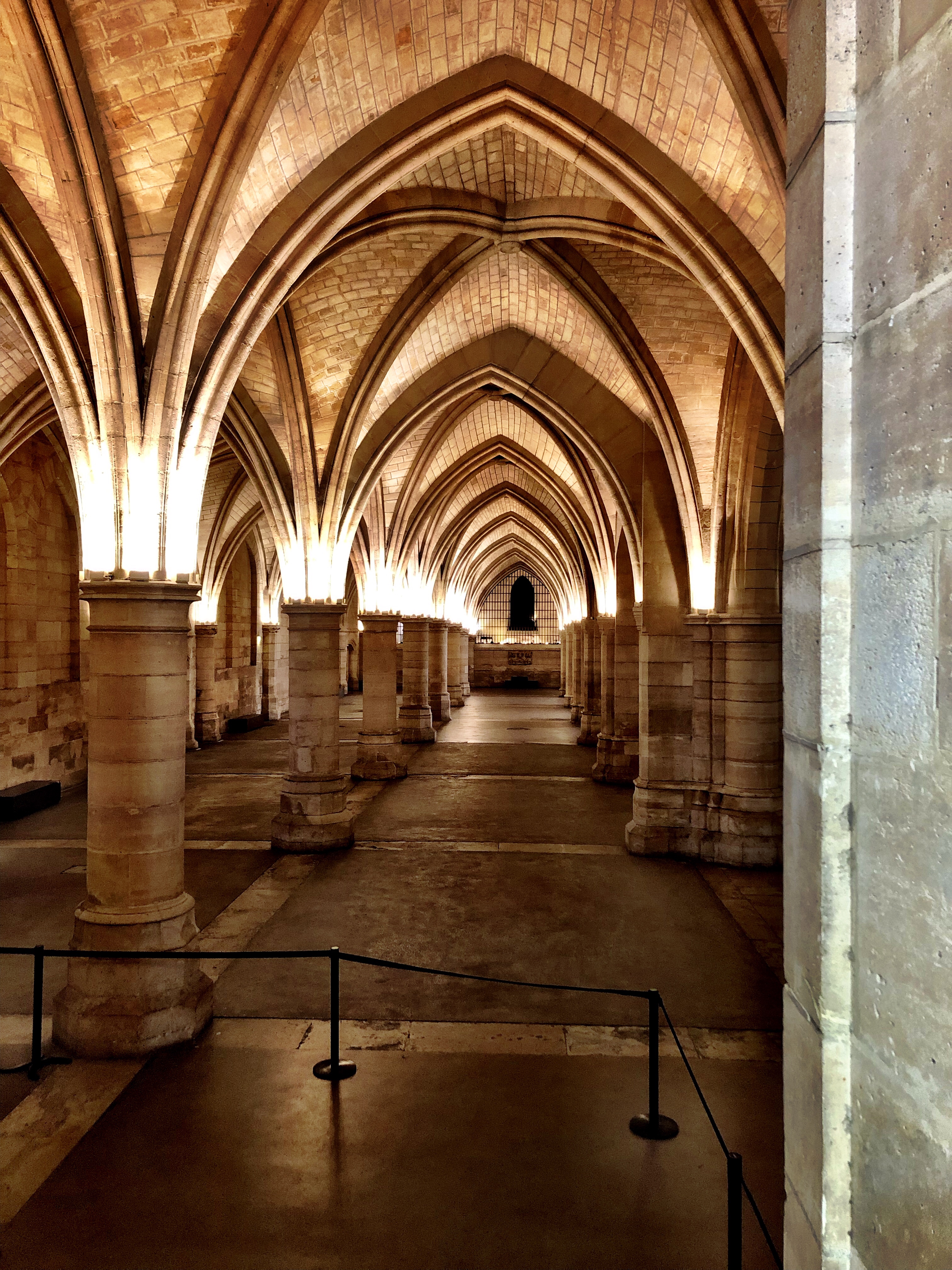 For most of its history during the Middle Ages, the Conciergerie was a busy palace and royal administrative center, teaming with nobility, soldiers, diplomats, administrators and petitioners. Only a small portion of the Conciergerie is open to visitors. But one of these areas is huge room called The Hall of the Soldiers, a massive, colonnaded space stretching 64 meters in length and 25 meter wide; it is located directly under the Great Hall and was used as a dining area for the over 2,000 servants required to keep the place ticking. The chill of winter was kept at bay with four monster fireplaces. Equally impressive is the adjacent kitchens. They include another four huge fireplaces which are each big enough to hold a dining table with seating for six.