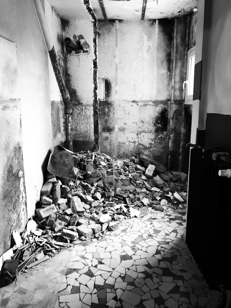 Speaking of being holed up in a half-finished house, the renovations are progressing. Some more walls have been demolished, a floor has been broken up, insulation has been blown in, lots and lots of wallboard and plaster has been put up, kilometers of electrical wire and radiator piping have been snaked, and mega-liters of paint have been splashed around – some of it even occasionally landing on a wall or ceiling. How convenient. We try to be disciplined and not rush things. But if you took a look around our séjour (living room) right now you would be able to tell that our discipline is in a precariously fragile state; we have hung paintings and placed furniture in the room, despite the fact that we still only have a subfloor down. Probably not the most pragmatic thing to do, but we desperately needed to feel at least a small sense of completion. Only one of the rooms in this house is currently not serving duty as a storage room: our master bathroom. And even that room still has work to be done on it. Oh well. I guess I can’t say we didn’t ask for it. All in all, we’re happy with the way the renovations have gone. Someday. Some day, we will have it finished and we can focus on travel a bit more.