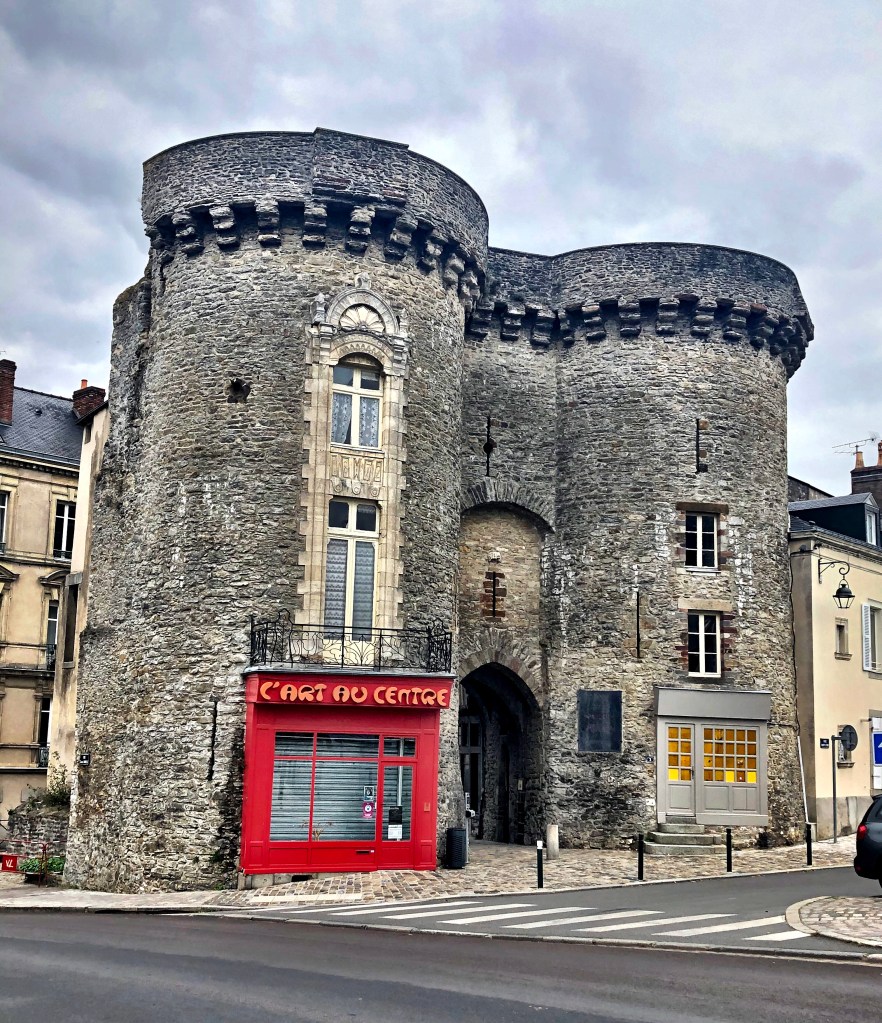 Just across from the cathedral are the remains of the town’s western gate, Porte Beucheresse. It’s a beautiful but lonely gate, having long ago lost its connection to the town walls. The two adjoined towers appear to be private residences. And they have been for quite a long time; a local artist of some repute (Rousseau – the 19th century post-impressionist naïve artist, not the philosopher) grew up in one of them. Impressive even now, they must have been very imposing when the town defenses were complete. At some point, some enterprising householder inserted a grand banque of renaissance windows in the left tower. Very posh.
