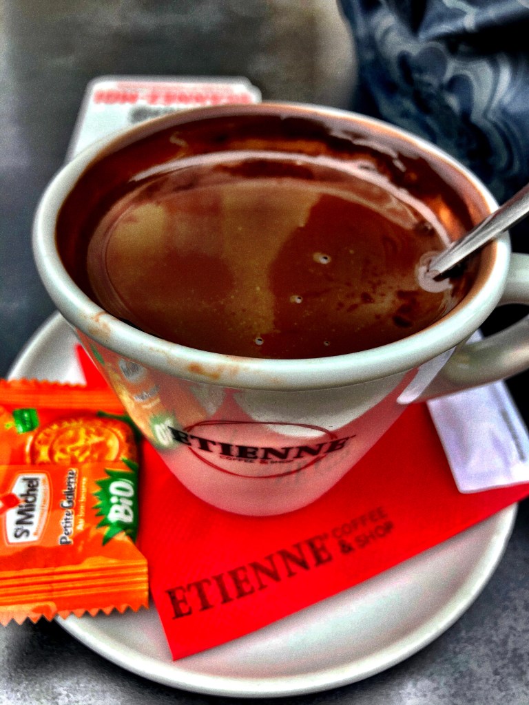 Our hot chocolate arrived in two small cups on saucers and, as always, with a small cookie on the side. Picking up my cup, I noticed that the luscious brown liquid inside didn’t move. Not a ripple. I put my small spoon in to stir and realized that the drink was thick, viscous. Cherie and I debated as to whether it was chocolate pudding or a chocolate bar, freshly melted from the microwave oven. Technically, it was liquid, although my spoon probably would have stood up in it if it had been plastic. To our surprise, the thick gloop in our cups was delicious. Velvety, smooth and creamy. But not overly rich and just the right touch of sweetness without being overpowering. In fact, it was really excellent. We settled in to happily sip our chocolate goo and munch away at our lunch while the pleasing sounds of other chatting tables and the protest filled the air. So French, and so soul-satisfying.