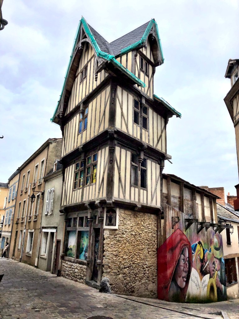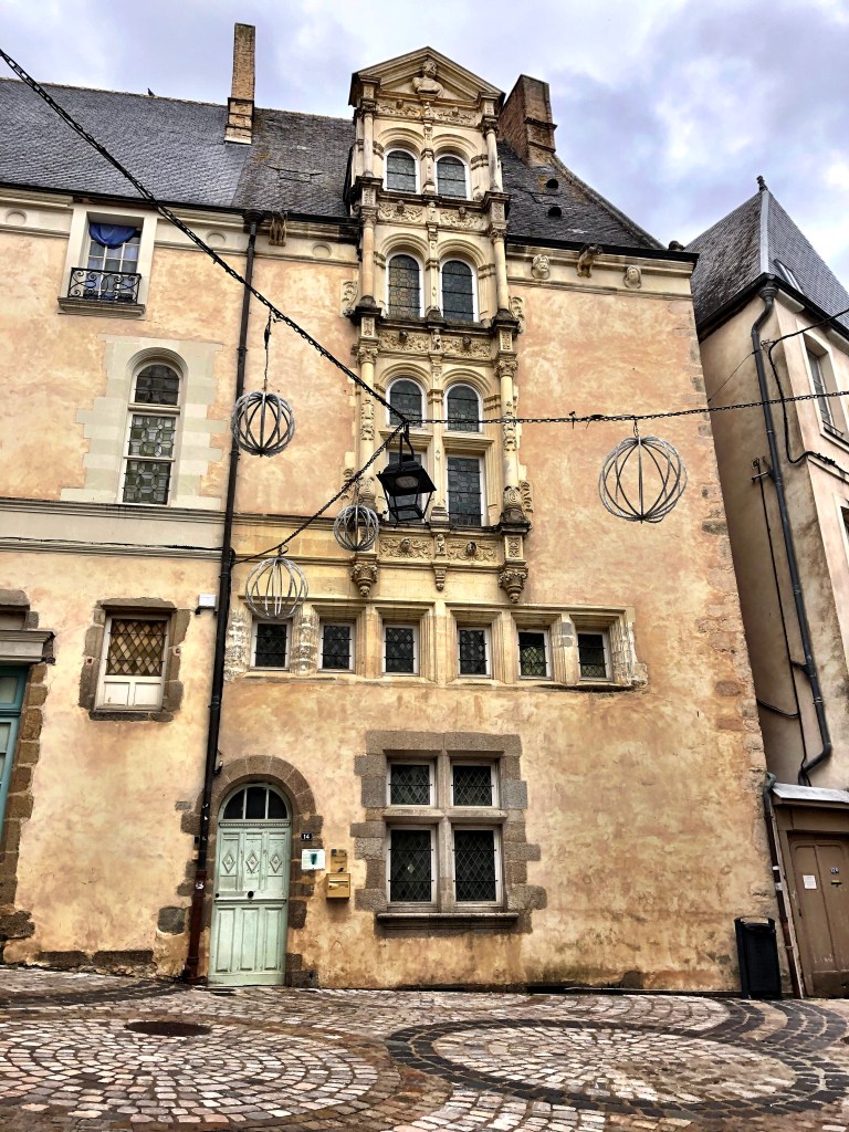 More wandering around the center of Laval brought us to more narrow lanes and quirky buildings, then down the slope to broad boulevards tastefully lined with rows of pretty shops offering everything from luxury goods to a coiffure à la mode. The quaint and tranquille medieval lanes had rapidly given way to a bustling and energetic commercial center. This area had a good vibe, too, and we enjoyed some pleasant window shopping. In fact, we decided that, along with Rennes and Vitré, Laval will be a good place to come shop for things we can’t find in Fougères.