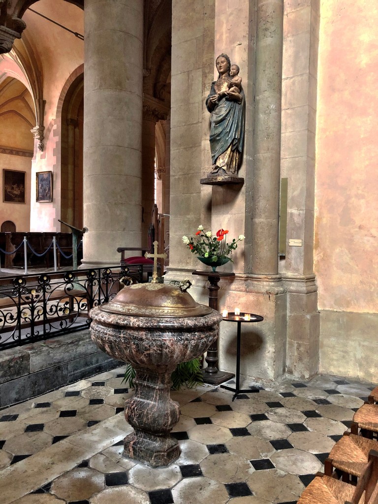 Food for later in hand, we continued westward to the Cathédrale de la Trinité. This church was begun in the 11th century, but it has been much altered throughout its history. In fact, they say it did not attain its current appearance until the beginning of the 20th century. I believe it. Although the cathedral is beautiful, it’s disparate elements never quite seem to blend harmoniously. Despite not being high on the list of churches we have visited, it’s still very interesting and well worth seeing. We both found the exterior to be a pleasing sight, its many gables and discordant rooflines offering an ever-interesting skyline to the viewer.