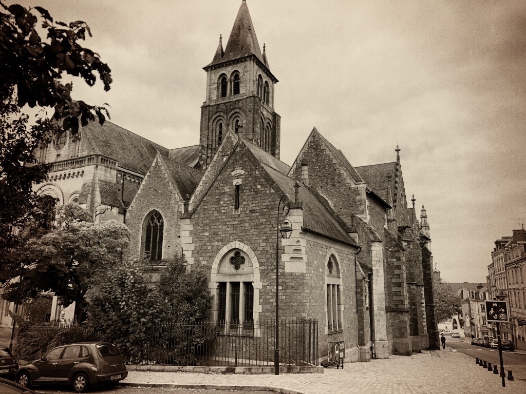 For now, our travels will have to be occasional and local. But, this being France, one never has to go far to see something extraordinary. Last weekend, we decided to visit a town in the nearby département of Mayenne (formerly the province of Maine). Laval, a mid-size town of about 49,000 people, is the capital of its département and straddles the Mayenne river running southward through its center. [see also, Mayenne in the Afternoon]. It’s just under an hour to drive from our house southeast to Laval, a picturesque jaunt through low, rolling hills with the smaller town of Ernée at midpoint in the journey. The city rises on either side of the river, a pleasing mix of townhomes, apartment buildings and businesses ranging from the 18th to late 20th century. The river itself is broad and calm as it runs under a tall rail viaduct, old bridges and a lock, lending a serene pace to the overcast Saturday afternoon of our visit.