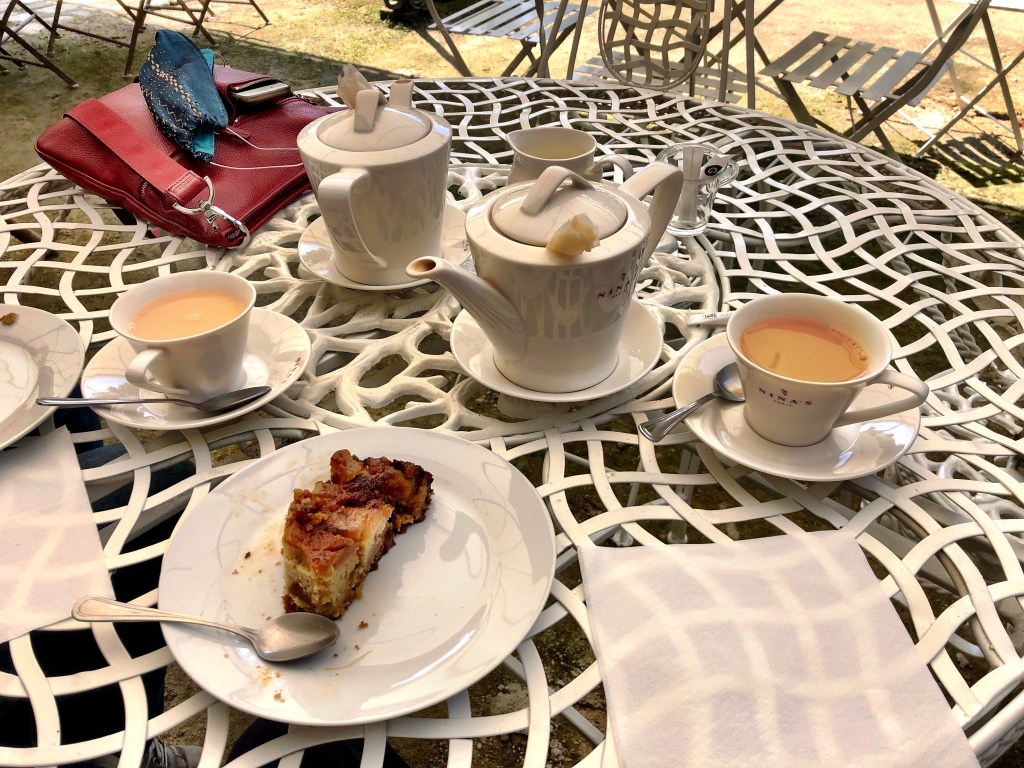 At this point, two things became urgent. Firstly, I had to pee. But a very close second was the need for tea and cake. Both of which were on offer at the tea room on the grounds – tea and cake, that is. Cherie selected a table under a large awning while I raced away to take care of that other urgent matter. Ballue offers a very nice tea room and we took full advantage. Cherie chose Ceylon and almond cake, while I went with trusty old Assam and pear cake. Excellent choices all around. The sun was out but the temperature was moderate as we whiled away a good hour over a laden table looking out to the front of the château and the garden set out before it. The bees were buzzing in the roses and potted herbs, and the birds were chittering away at each other as they went about their birdy business. And we two companions-for-life talked about everything and nothing while sipping tea and sharing each other’s cakes. Heaven.