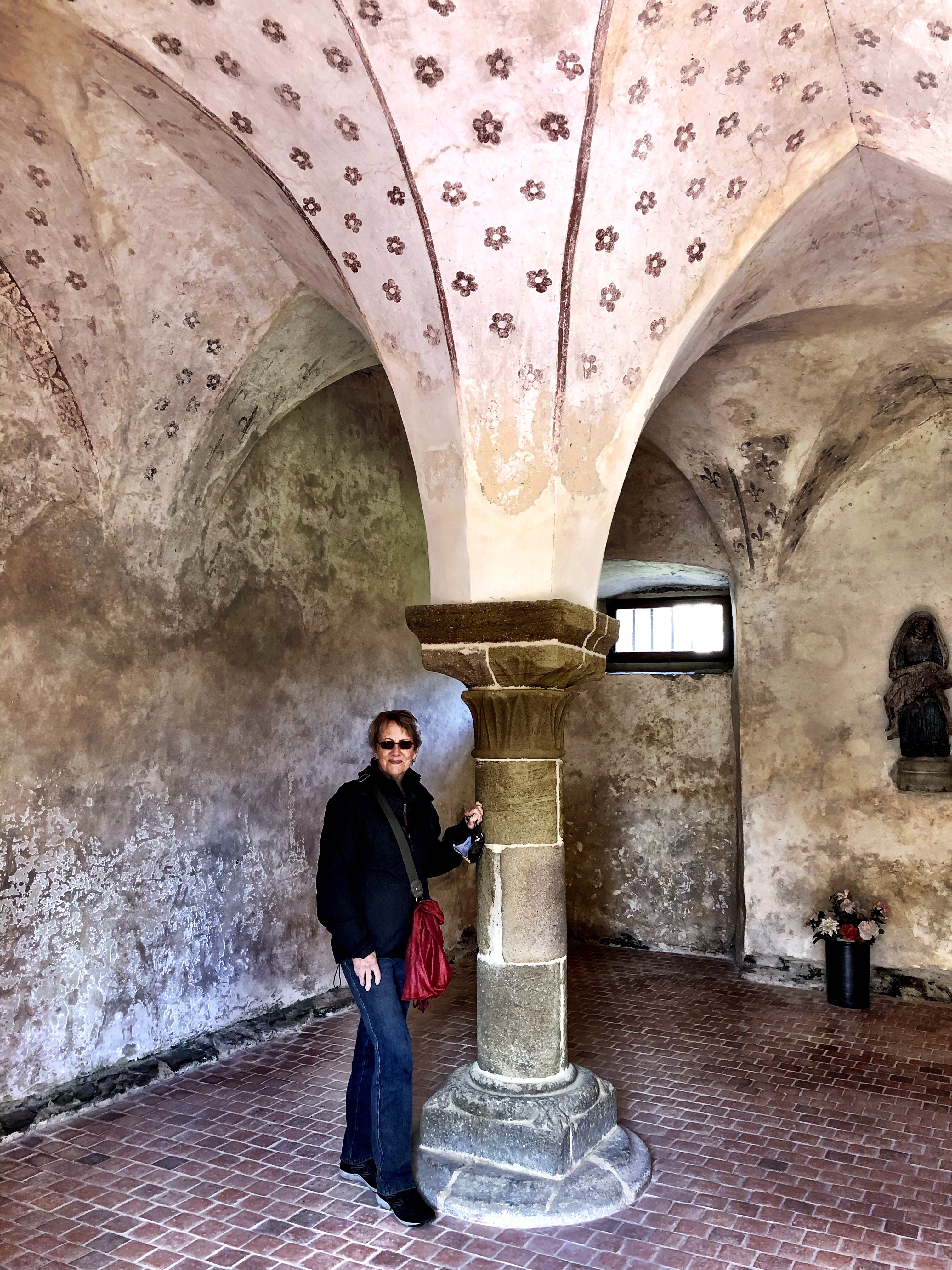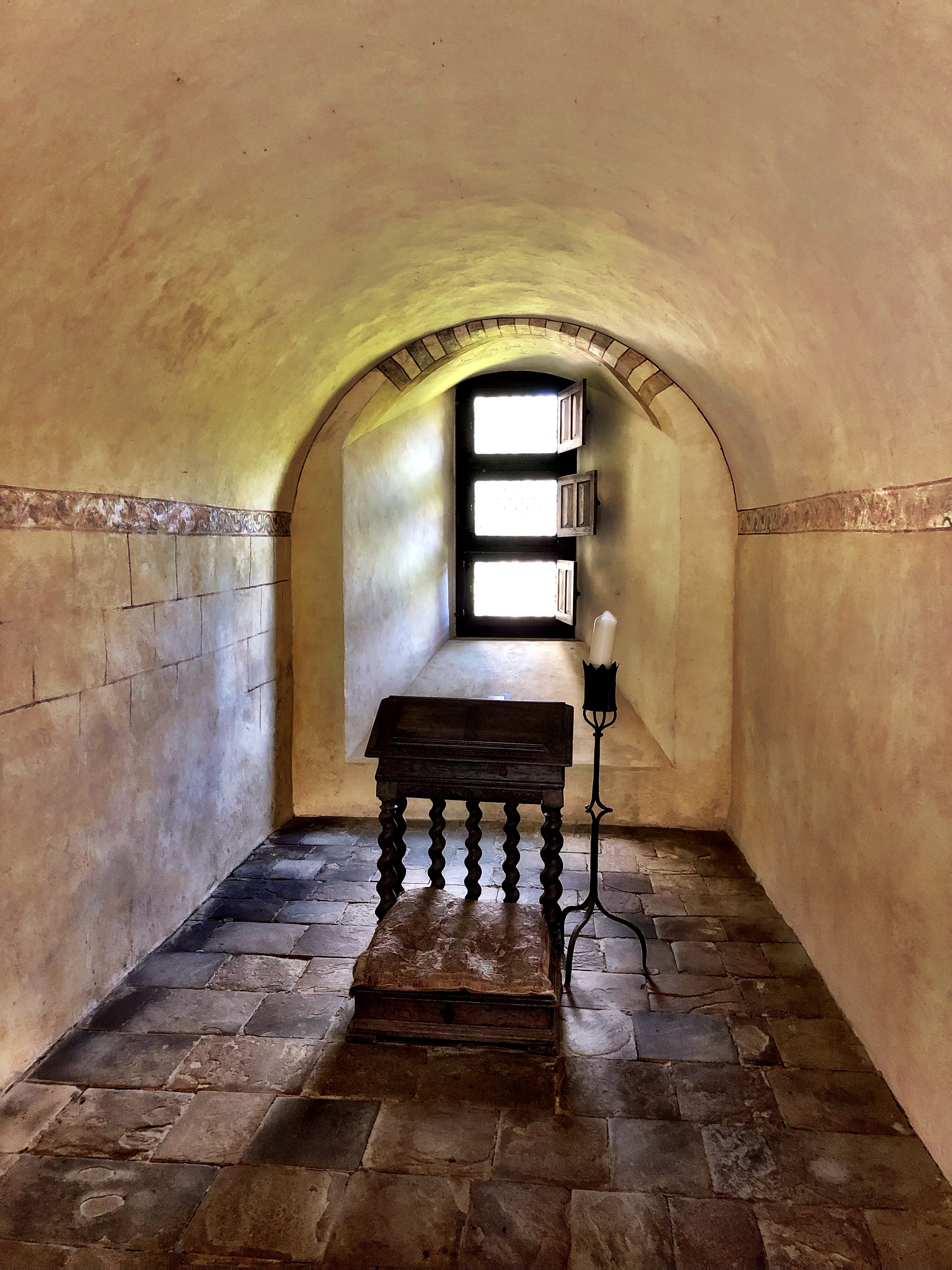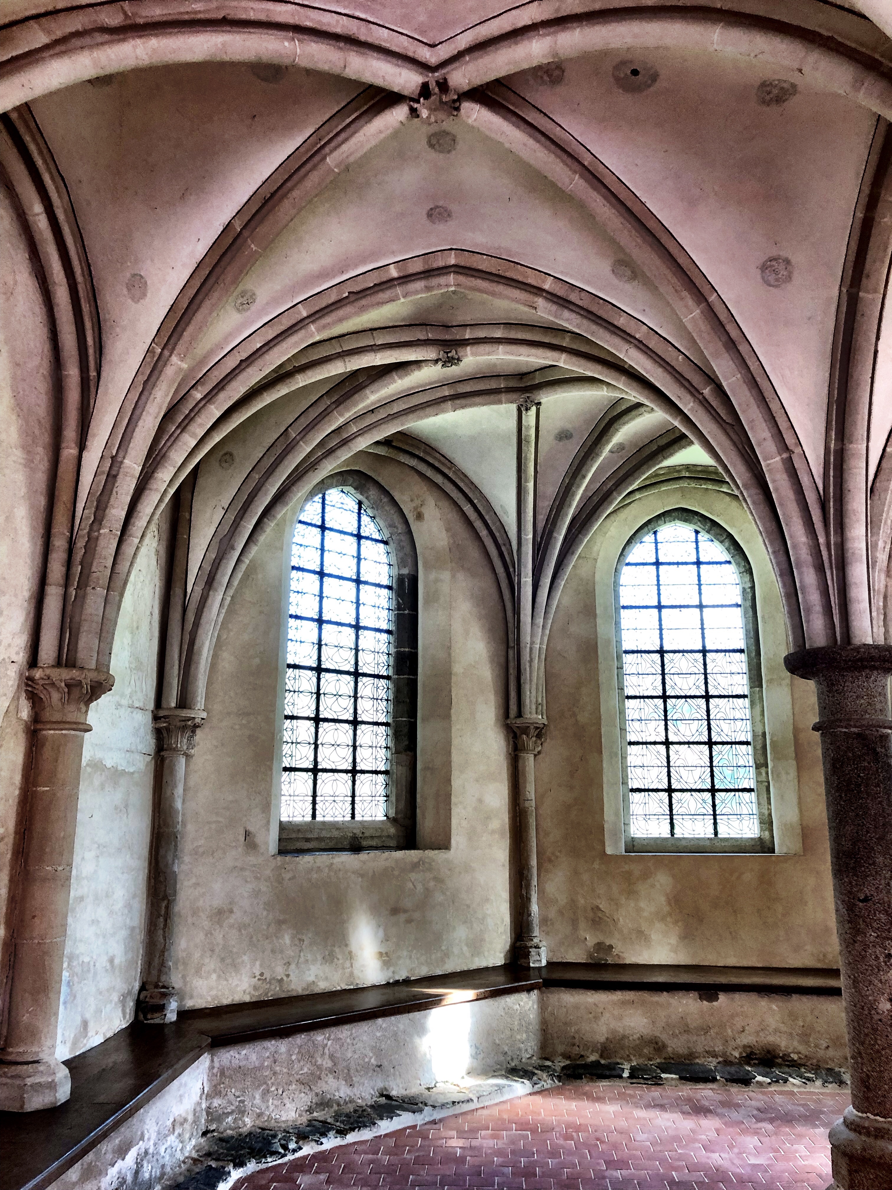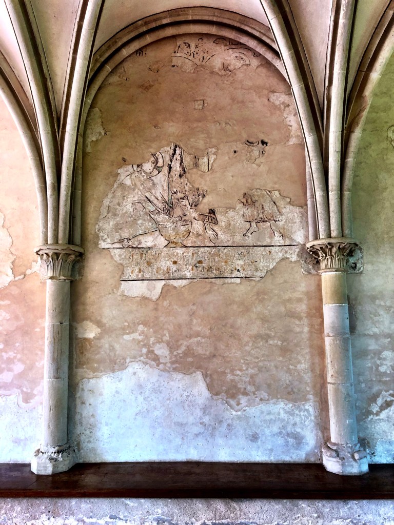 Even though a good deal of stone was taken (vandalized, in my opinion) from the church, and the entirety of the cloister was removed, the original plan of the monastic complex is still clear. A well-written and succinct visitor guide comes with the price of a ticket provides excellent descriptions of the major areas. But I was so transfixed with the glorious medieval religious and lay architecture that I barely glanced at the guide. It’s a tremendous example of a monastic community from the Middle Ages and several of the rooms – the chapter house, sacristy and kitchens in particular – have been nicely restored/conserved and furnished. I spent a few minutes just sitting quietly in the chapter house, soaking up the atmosphere and marveling at the medieval builders and sculptors who created such beautiful and evocative spaces. A surprisingly good deal of original lime plaster and painted decoration remains on the walls of several chambers. It’s a direct glimpse of what the monks and lay brothers must have seen in their own time, and real pleasure to see in the 21st century!
