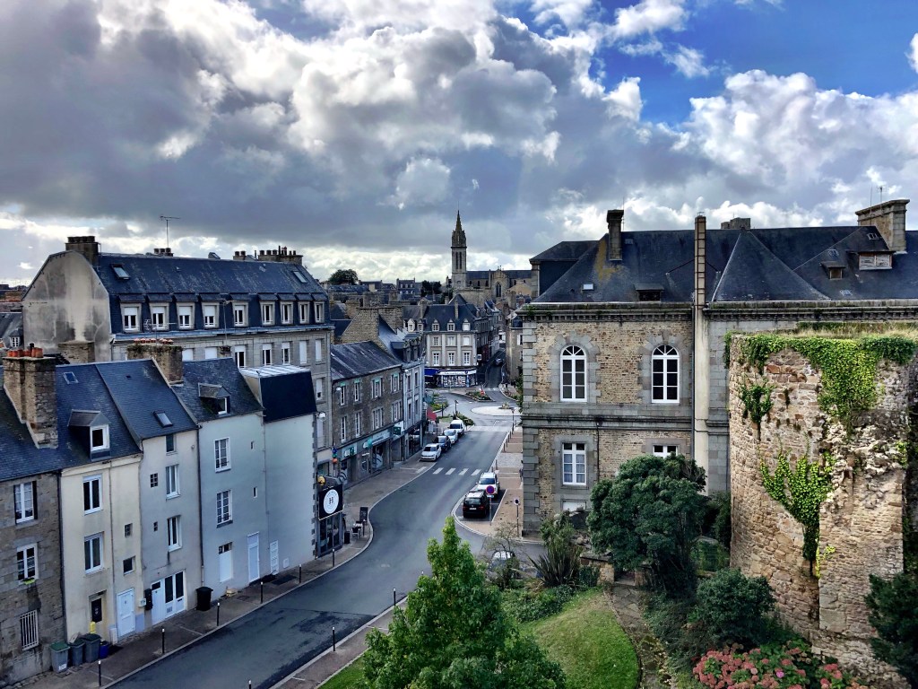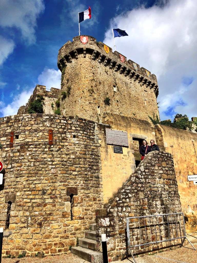 We arrived in town around noon on a cool but sunny day and found ourselves wandering toward the ruins of the old castle. There are substantial vestiges of the medieval fortifications, including ramparts and towers. They have all been well-conserved. Although only a small part of the château now remains, the town has cleverly incorporated garden areas amongst the stone ruins. It is quite well done, with small, intimate areas where one can take an outdoor lunch or simply enjoy the pretty plantings pleasingly juxtaposed against the stone structures enfolding them at various levels. Within this complex of ruins is the Scriptorial, a museum of jarringly modern concrete box form which houses a large collection of medieval manuscripts that were formerly in the libraries of the abbey of Mont-Saint-Michel. Wisely, we did not attempt a visit. For I could easily have spent the remainder of the day there, engrossed in the beauty of such magnificent works of knowledge, art, and craft. I’m at least self-aware enough to realize that not everyone shares my mania for medieval books and art. Weird, huh? Still, it’s a visit for another time.