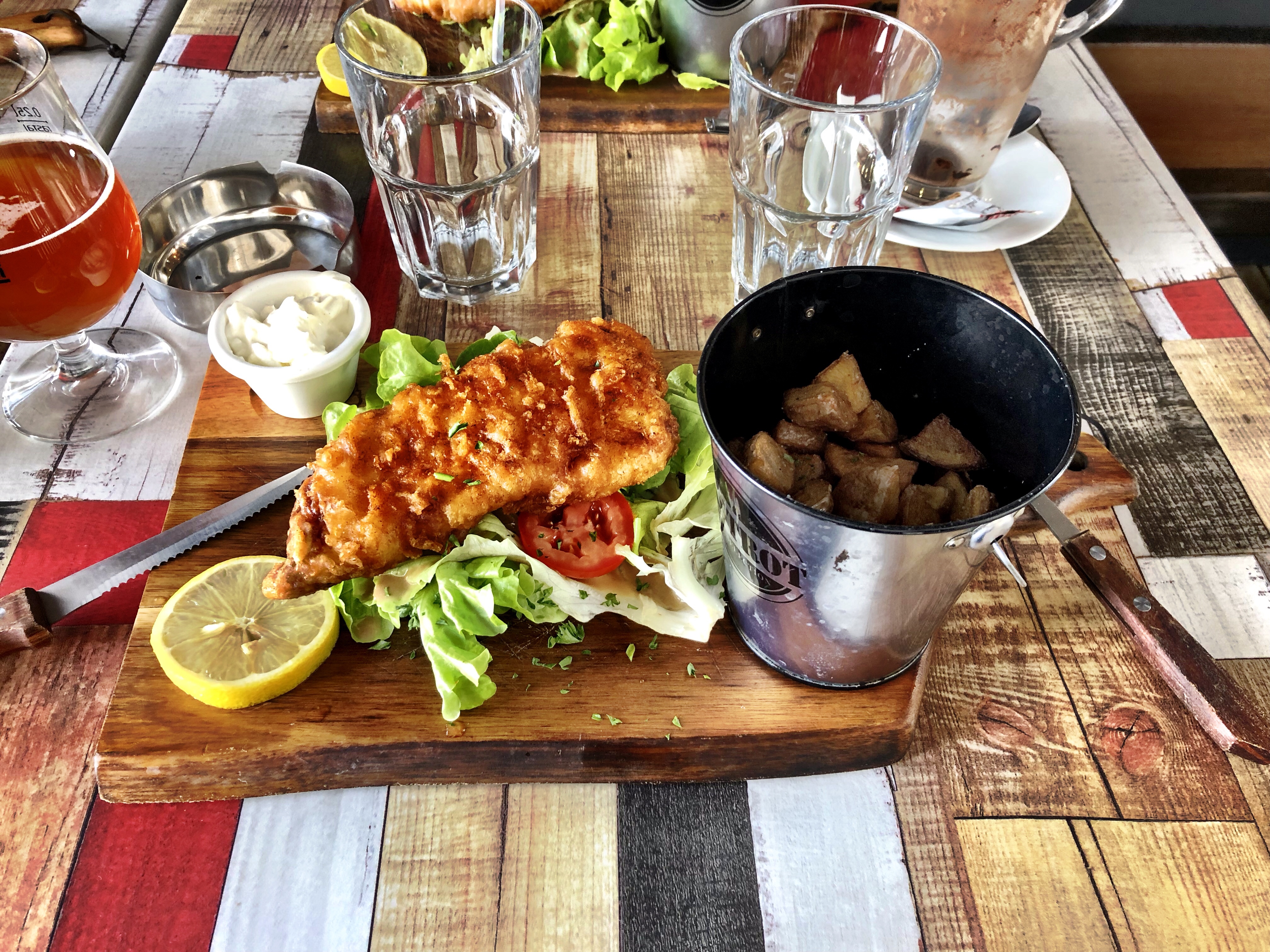 Our stomachs grumbling, we disembarked from the castle ruins and sought out a nice little place for lunch. As luck would have it, we found one close by. In fact, you could easily hit it with a rock from the castle ramparts. Not that we tried, mind you. Val enjoyed a nice slice of quiche (smoked salmon and leek) while Cherie and I both had the fish and chips. Topped off with some tasty beer, we enjoyed a lovely meal.