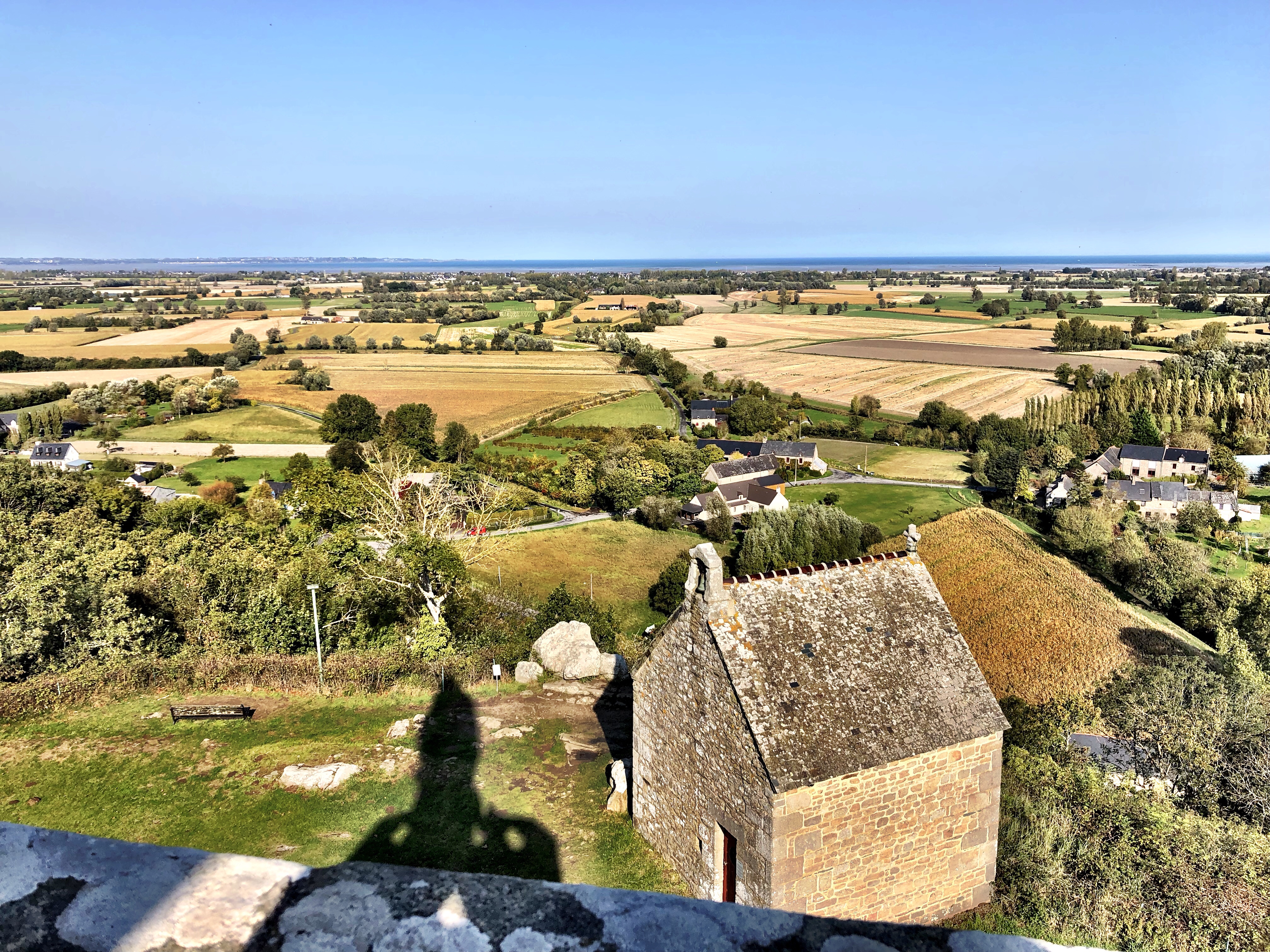 At the top of the 65-meter tall outcrop is a nicely restored stone windmill. It can be toured, but it was closed when we were there. Still, it’s worth a look to get a sense of how the landscape of the past must have been dotted with these all-important machines. At the very summit is a small chapel, the current iteration constructed in the 19th century. Next to it is a signal tower from the Napoleonic era. It was one of a long string of towers sited on high points in the landscape, each one in sight of the other so that messages could be transmitted with great speed across the landscape. Mostly they were meant to alert the French military that the British were coming – again! The view from the top of the tower is magnificent. You can even see Mont Saint Michel!