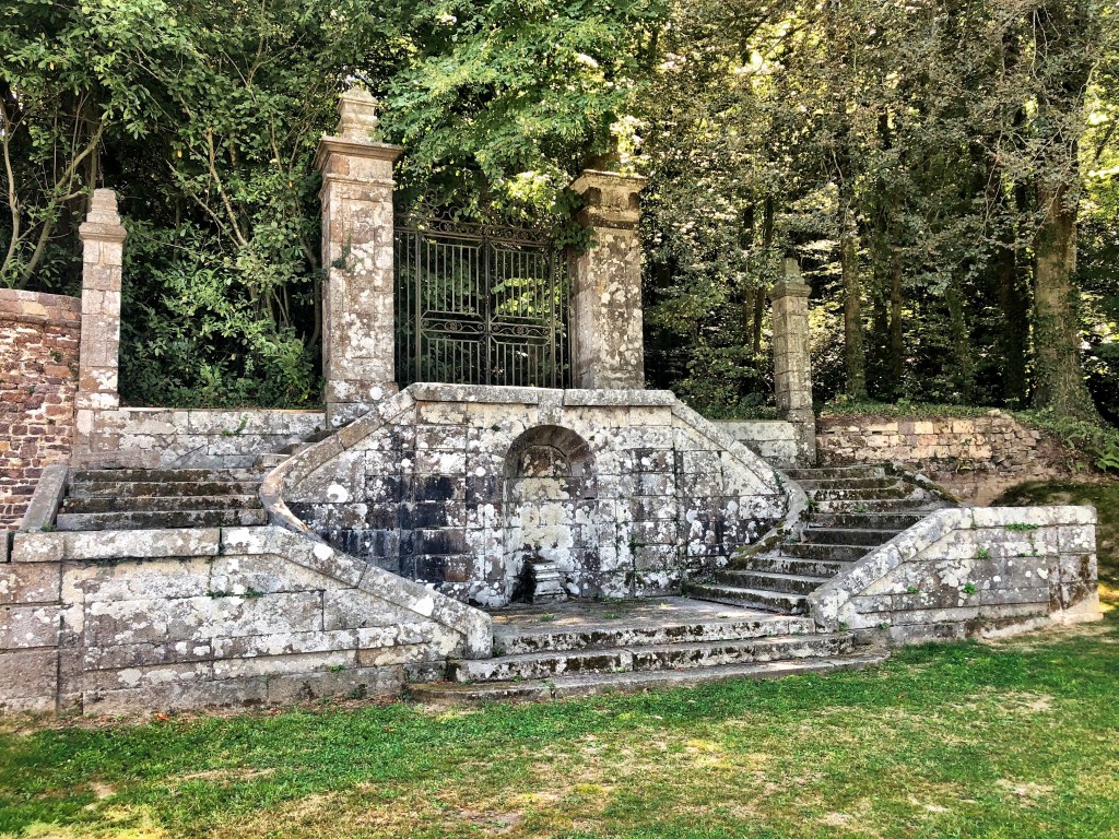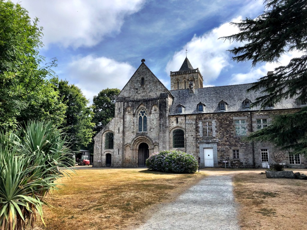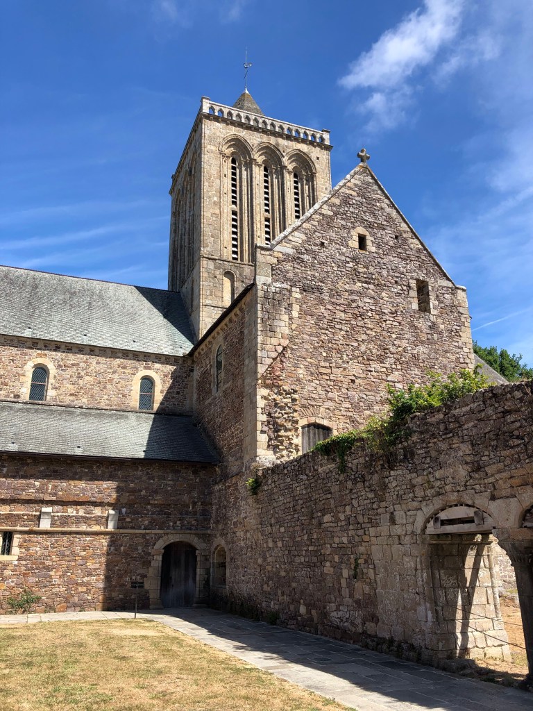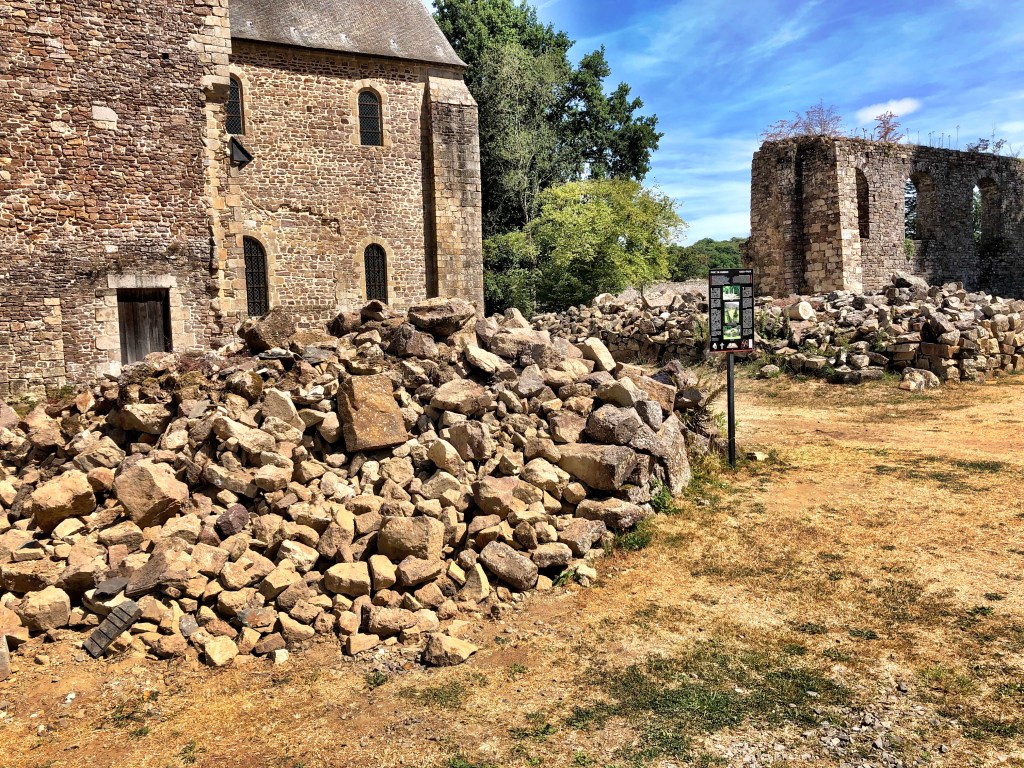 We did a fun thing yesterday. We went to Normandie and visited the medieval abbey of Lucerne. This artfully stacked pile of stones is only about an hour’s drive northwest of Fougères. Although it was perhaps a bit warm for Cherie’s taste, the weather was otherwise perfect. Most of the drive is easy, but the last few kilometers takes you though pretty country lanes which wind their way through verdant, hedgerow-enclosed pastures and timeless farmsteads that appear to have stood in place since the last ice age. These narrow country roads, we noted, were very well kept indeed. The verges were mown with immaculate precision. And all of the power and communications lines were neatly strung on regular rows of slim steel posts flanking the way. From what we’ve seen, the vast majority of infrastructure in France is well-maintained and well-presented. But the roads in this area were above and beyond the call. Impressive. And endearing. It was a fine way to approach a medieval abbey.