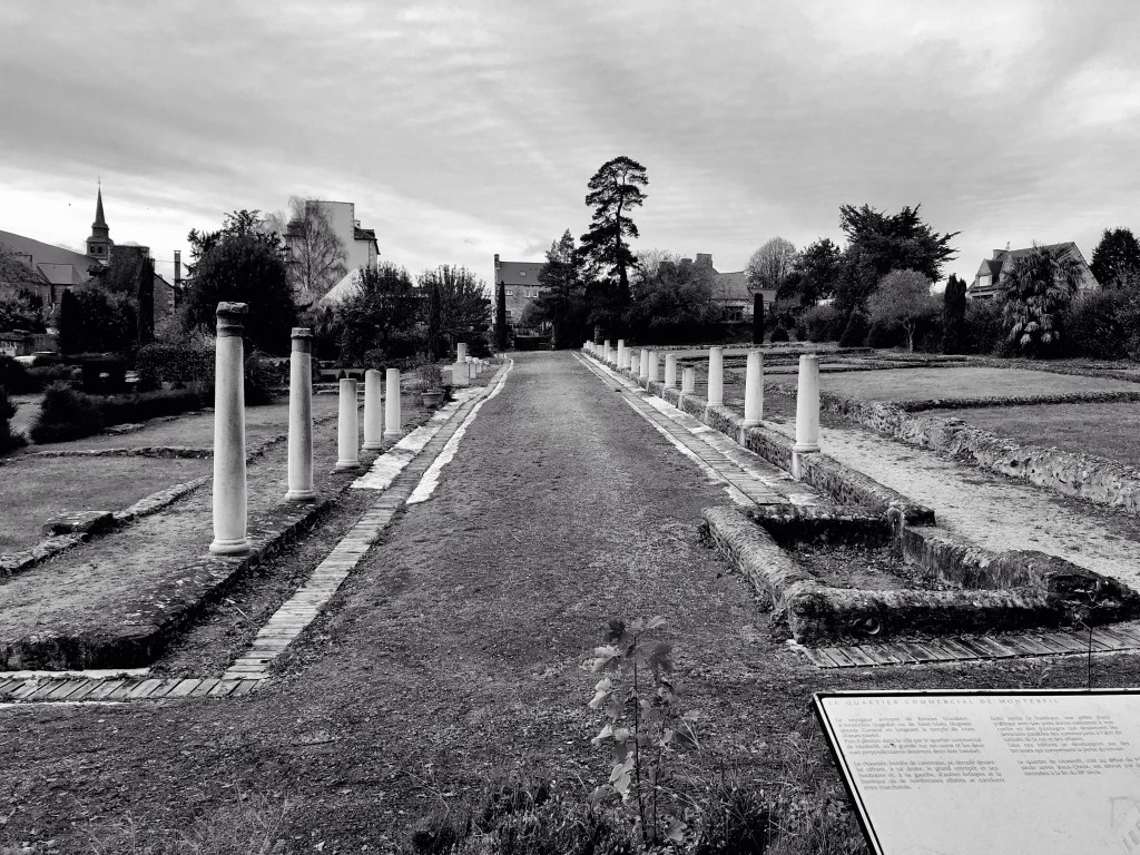 The ruins in Corseul are subtle. One can walk down a short section of streetscape marked by the remains of townhouse and warehouse foundations. Well-posted interpretive signs help visitors to imagine the scene as it may have been as a bustling hub. Extensively excavated in the 1980’s and 1990’s, the remains have been tidied up quite a bit. This includes what appeared to us as the imposition of cement copies of architectural elements such as rows of columns, textured and broken. A problematic practice which is, thankfully, rarely employed.