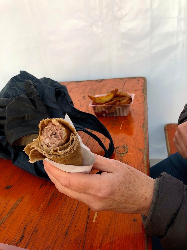 My aromatic, steamy wine cupped lovingly in my now-warm hands, we then could move on to that other most-cherished of Breton traditions: the communal outdoor consumption of galettes-saucisses et frites. The Bretons have never met weather foul enough which would prevent them from taking a meal outdoors. Preferably amongst the company of as many friends, family and complete strangers as possible. Welcome to my nightmare. To be fair, our sausages wrapped in thin buckwheat galettes were excellent, along with the roasted potato wedges. Maybe it was the cozy wine softening my hard heart, but I actually enjoyed our meal. In a freezing tent. With a few dozen strangers.